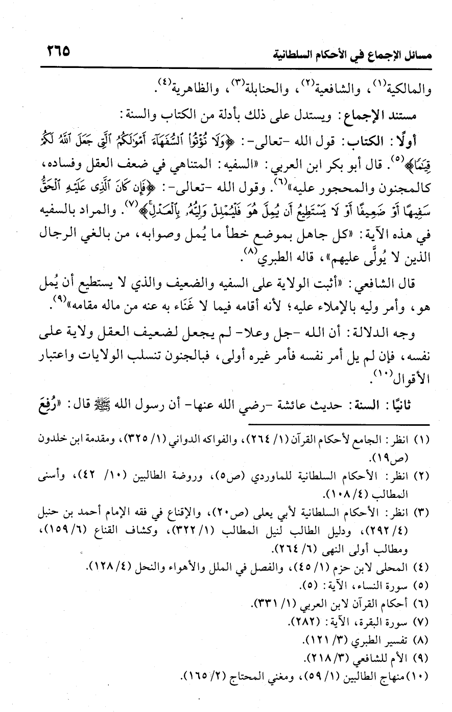 • أولًا: الكتاب: قول اللَّه -تعالى-: {وَلَا تُؤْتُوا السُّفَهَاءَ أَمْوَالَكُمُ الَّتِي جَعَلَ اللَّهُ لَكُمْ قِيَامًا} (¬5). قال أبو بكر ابن العربي: "السفيه: المتناهي في ضعف العقل وفساده، كالمجنون والمحجور عليه" (¬6). وقول اللَّه -تعالى-: {فَإِنْ كَانَ الَّذِي عَلَيْهِ الْحَقُّ سَفِيهًا أَوْ ضَعِيفًا أَوْ لَا يَسْتَطِيعُ أَنْ يُمِلَّ هُوَ فَلْيُمْلِلْ وَلِيُّهُ بِالْعَدْلِ} (¬7). والمراد بالسفيه في هذه الآية: "كل جاهل بموضع خطأ ما يُمل وصوابه، من بالغي الرجال الذين لا يُولَّى عليهم"، قاله الطبري (¬8).