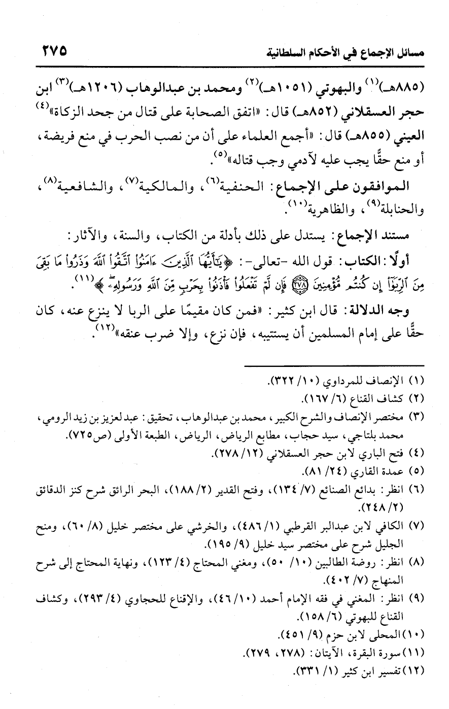 (885 هـ) (¬1) والبهوتي (1051 هـ) (¬2) ومحمد بن عبد الوهاب (1206 هـ) (¬3) ابن حجر العسقلاني (852 هـ) قال: "اتفق الصحابة على قتال من جحد الزكاة" (¬4) العيني (855 هـ) قال: "أجمع العلماء على أن من نصب الحرب في منع فريضة، أو منع حقًّا يجب عليه لآدمي وجب قتاله" (¬5).