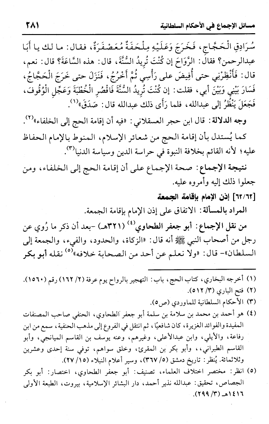 كما يُستدل بأن إقامة الحج من شعائر الإسلام، المنوط بالإمام الحفاظ عليه؛ لأنه القائم بخلافة النبوة في حراسة الدين وسياسة الدنيا (¬3).Rصحة الإجماع على أن إقامة الحج إلى الخلفاء، ومن جعلوا ذلك إليه وأمروه عليه.