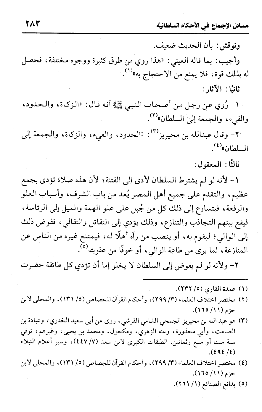 1 - رُوي عن رجل من أصحاب النبي -صلى اللَّه عليه وسلم- أنه قال: "الزكاة، والحدود، والفيء، والجمعة إلى السلطان" (¬2).