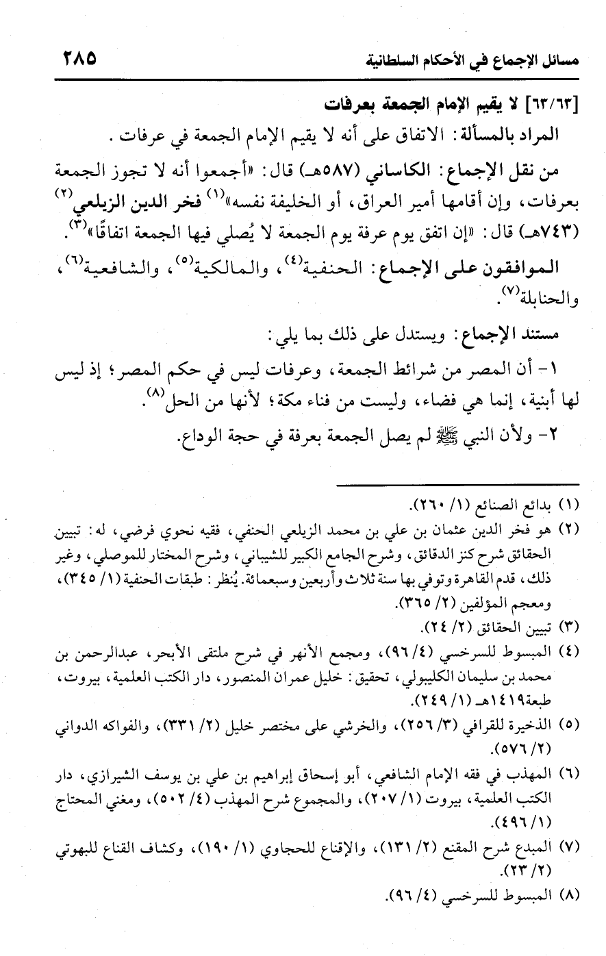 • من نقل الإجماع: الكاساني (587 هـ) قال: "أجمعوا أنه لا تجوز الجمعة بعرفات، وإن أقامها أمير العراق، أو الخليفة نفسه" (¬1) فخر الدين الزيلعي (¬2) (743 هـ) قال: "إن اتفق يوم عرفة يوم الجمعة لا يُصلي فيها الجمعة اتفاقًا" (¬3).