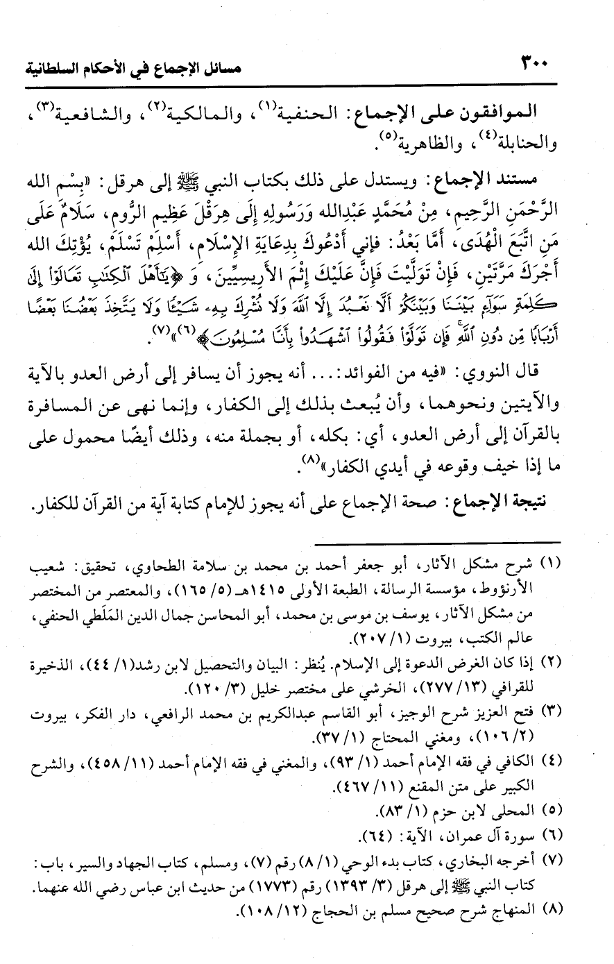 قال النووي: "فيه من الفوائد: . . . أنه يجوز أن يسافر إلى أرض العدو بالآية والآيتين ونحوهما، وأن يُبعث بذلك إلى الكفار، وإنما نهى عن المسافرة بالقرآن إلى أرض العدو، أي: بكله، أو بجملة منه، وذلك أيضًا محمول على ما إذا خيف وقوعه في أيدي الكفار" (¬8).Rصحة الإجماع على أنه يجوز للإمام كتابة آية من القرآن للكفار.