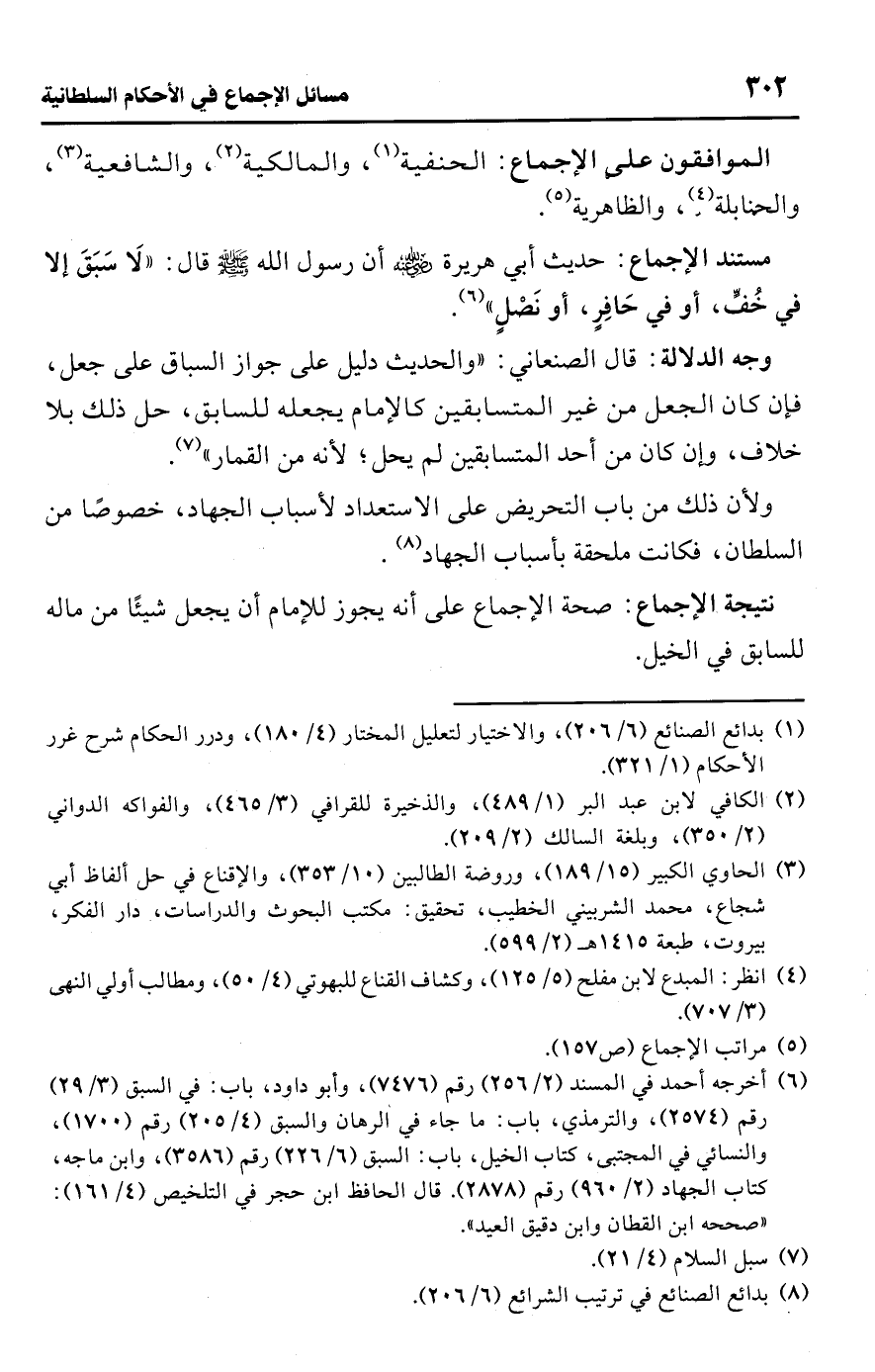 • مستند الإجماع: حديث أبي هريرة -رضي اللَّه عنه- أن رسول اللَّه -صلى اللَّه عليه وسلم- قال: "لَا سَبَقَ إلا في خُفٍّ، أو في حَافِرٍ، أو نَصْلٍ" (¬6).