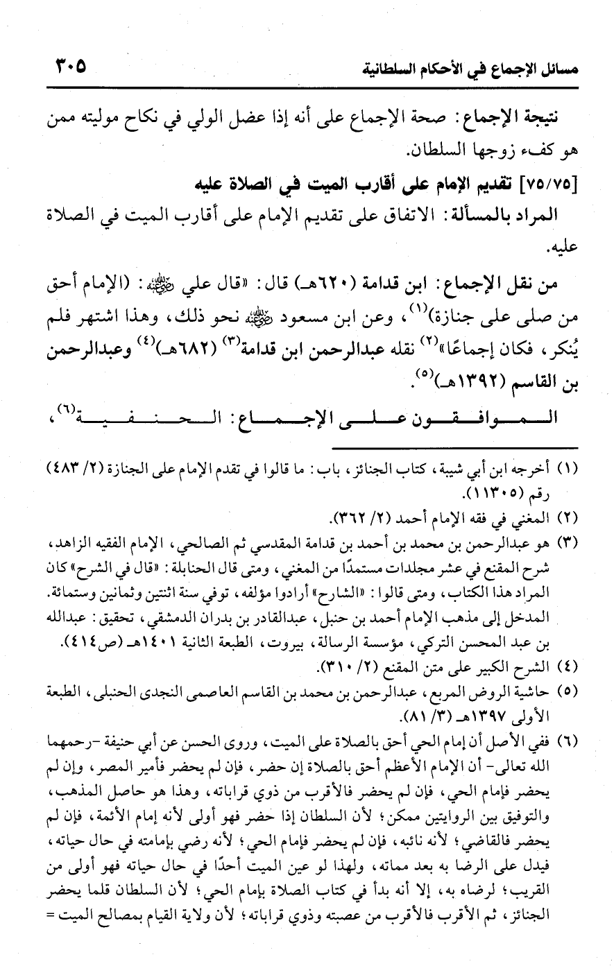 • من نقل الإجماع: ابن قدامة (620 هـ) قال: "قال علي -رضي اللَّه عنه-: (الإمام أحق من صلى على جنازة) (¬1)، وعن ابن مسعود -رضي اللَّه عنه- نحو ذلك، وهذا اشتهر فلم يُنكر، فكان إجماعًا" (¬2) نقله عبد الرحمن ابن قدامة (¬3) (682 هـ) (¬4) وعبد الرحمن بن القاسم (1392 هـ) (¬5).