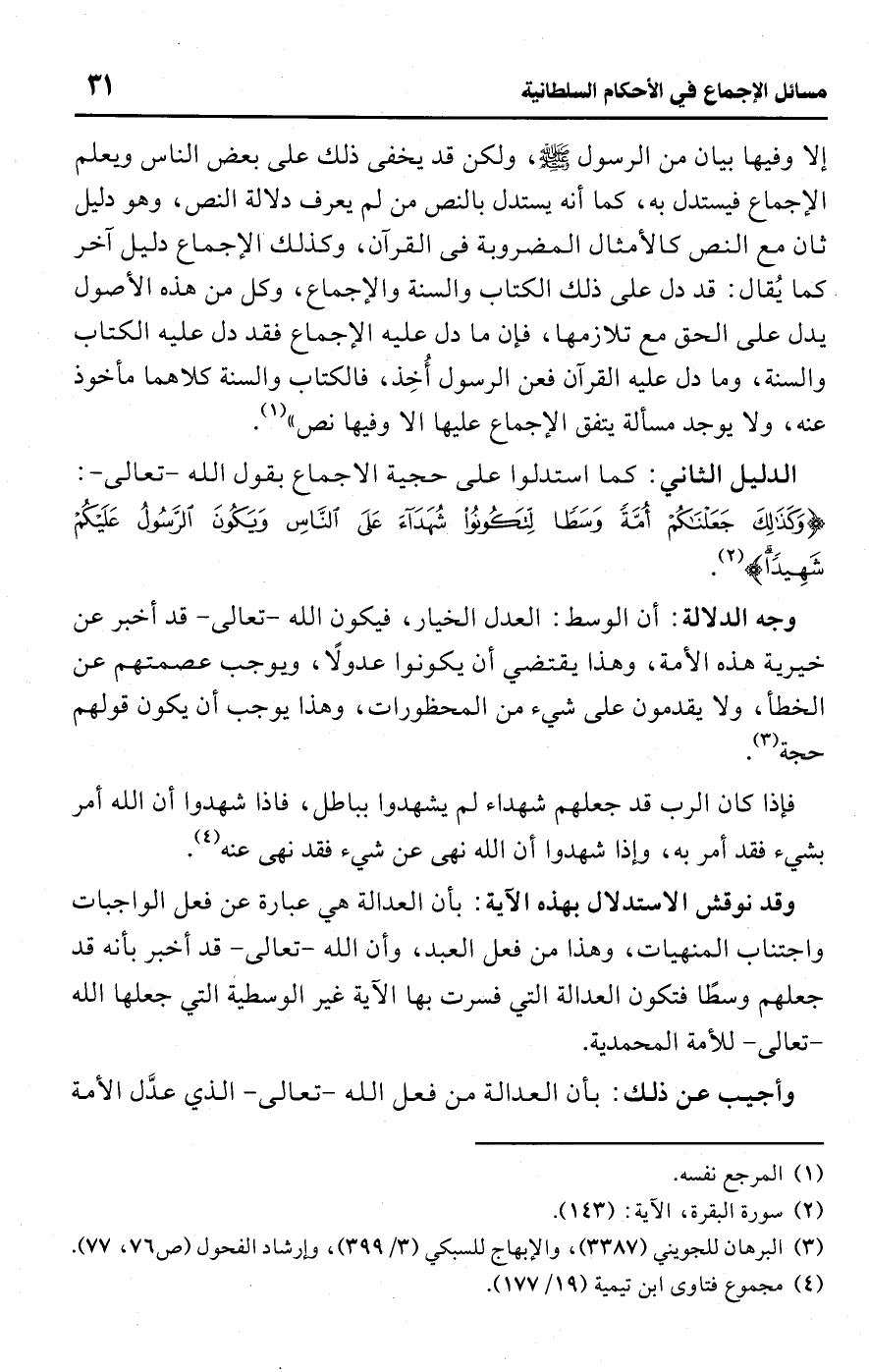 الدليل الثاني: كما استدلوا على حجية الإجماع بقول اللَّه -تعالى-: {وَكَذَلِكَ جَعَلْنَاكُمْ أُمَّةً وَسَطًا لِتَكُونُوا شُهَدَاءَ عَلَى النَّاسِ وَيَكُونَ الرَّسُولُ عَلَيْكُمْ شَهِيدًا} (¬2).
