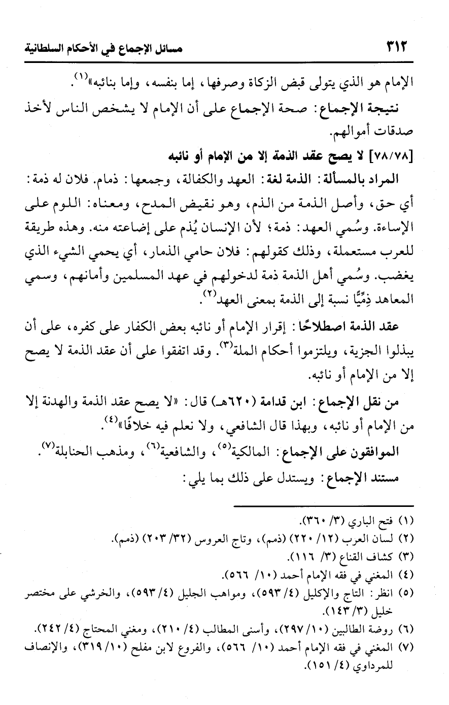 • من نقل الإجماع: ابن قدامة (620 هـ) قال: "لا يصح عقد الذمة والهدنة إلا من الإمام أو نائبه، وبهذا قال الشافعي، ولا نعلم فيه خلافًا" (¬4).