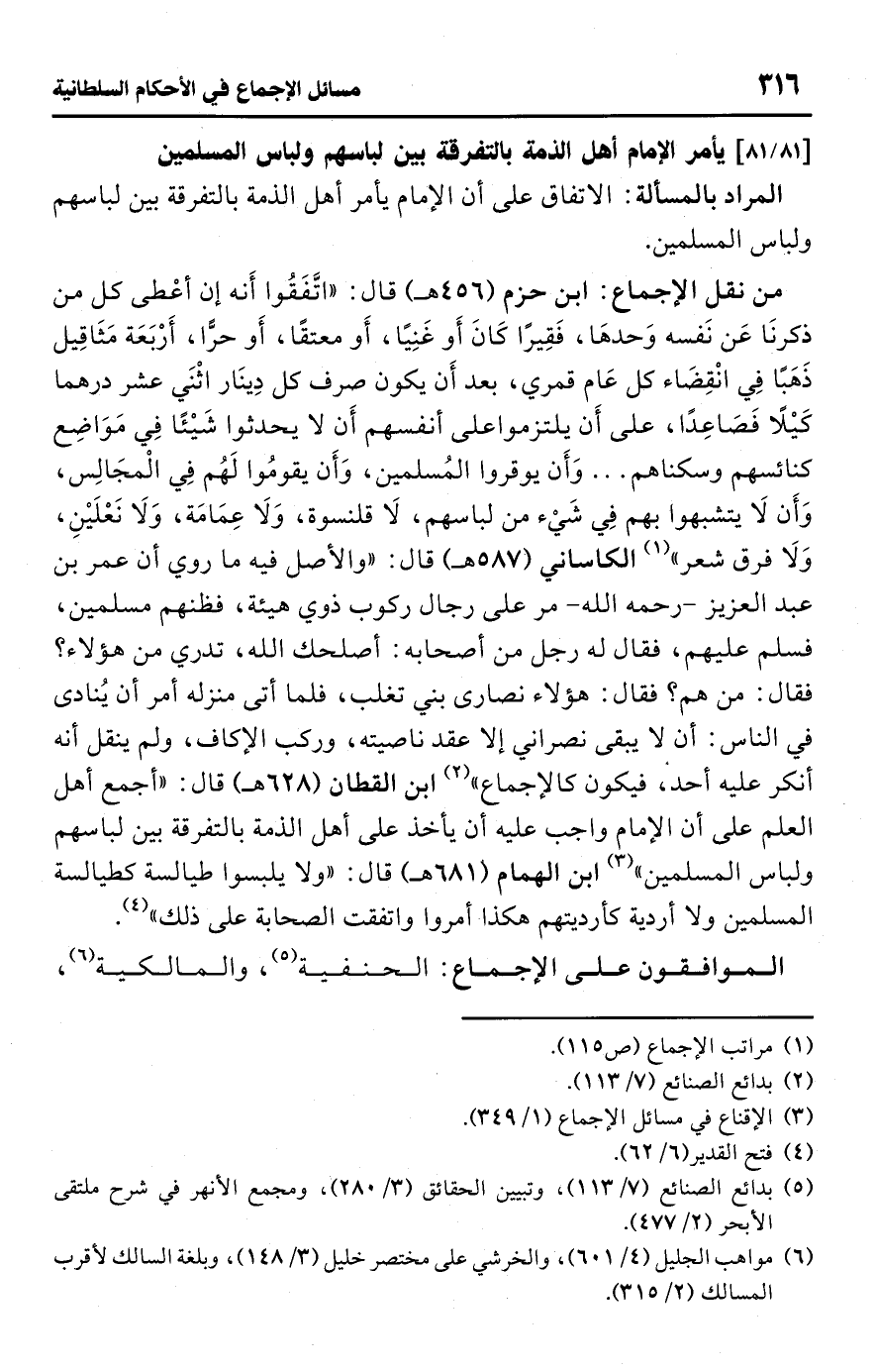 • من نقل الإجماع: ابن حزم (456 هـ) قال: "اتَّفَقُوا أَنه إن أعْطى كل من ذكرنَا عَن نَفسه وَحدهَا، فَقِيرا كَانَ أَو غَنِيًا، أَو معتقًا، أَو حرًّا، أَرْبَعَة مَثَاقِيل ذَهَبًا فِي انْقِضَاء كل عَام قمري، بعد أَن يكون صرف كل دِينَار اثْنَي عشر درهما كَيْلًا فَصَاعِدًا، على أَن يلتزموا على أنفسهم أَن لا يحدثوا شَيْئًا فِي مَوَاضِع كنائسهم وسكناهم. . . وَأَن يوقروا المُسلمين، وَأَن يقومُوا لَهُم فِي الْمجَالِس، وَأَن لَا يتشبهوا بهم فِي شَيْءٍ من لباسهم، لَا قلنسوة، وَلَا عِمَامَة، وَلَا نَعْلَيْنِ، وَلَا فرق شعر" (¬1) الكاساني (587 هـ) قال: "والأصل فيه ما روي أن عمر بن عبد العزيز -رحمه اللَّه- مر على رجال ركوب ذوي هيئة، فظنهم مسلمين، فسلم عليهم، فقال له رجل من أصحابه: أصلحك اللَّه، تدري من هؤلاء؟ فقال: من هم؟ فقال: هؤلاء نصارى بني تغلب، فلما أتى منزله أمر أن يُنادى في الناس: أن لا يبقى نصراني إلا عقد ناصيته، وركب الإكاف، ولم ينقل أنه أنكر عليه أحد، فيكون كالإجماع" (¬2) ابن القطان (628 هـ) قال: "أجمع أهل العلم على أن الإمام واجب عليه أن يأخذ على أهل الذمة بالتفرقة بين لباسهم ولباس المسلمين" (¬3) ابن الهمام (681 هـ) قال: "ولا يلبسوا طيالسة كطيالسة المسلمين ولا أردية كأرديتهم هكذا أمروا واتفقت الصحابة على ذلك" (¬4).