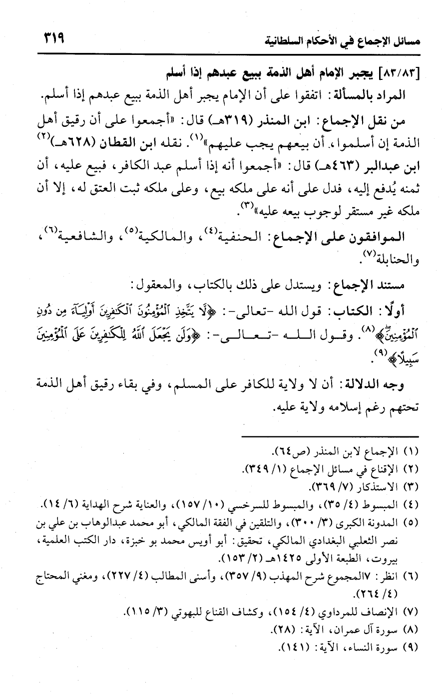 • من نقل الإجماع: ابن المنذر (319 هـ) قال: "أجمعوا على أن رقيق أهل الذمة إن أسلموا، أن بيعهم يجب عليهم" (¬1). نقله ابن القطان (628 هـ) (¬2) ابن عبد البر (463 هـ) قال: "أجمعوا أنه إذا أسلم عبد الكافر، فبيع عليه، أن ثمنه يُدفع إليه، فدل على أنه على ملكه بيع، وعلى ملكه ثبت العتق له، إلا أن ملكه غير مستقر لوجوب بيعه عليه" (¬3).
