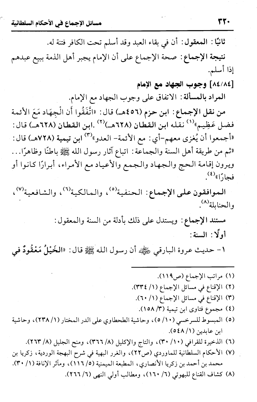 • من نقل الإجماع: ابن حزم (456 هـ) قال: "اتَّفَقُوا أَن الْجِهَاد مَعَ الأئمة فضل عَظِيم" (¬1) نقله ابن القطان (628 هـ) (¬2).