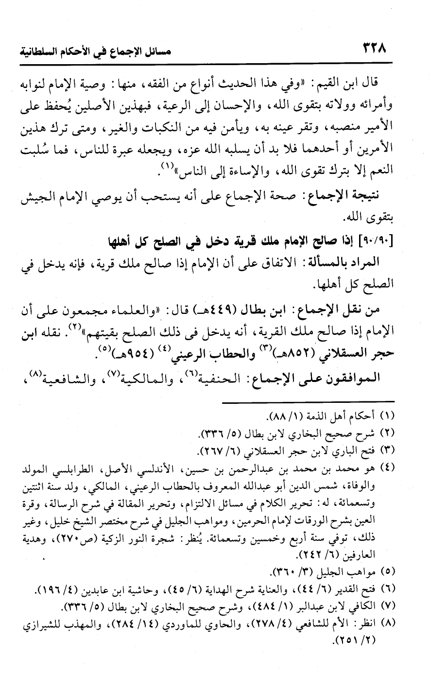 • من نقل الإجماع: ابن بطال (449 هـ) قال: "والعلماء مجمعون على أن الإمام إذا صالح ملك القرية، أنه يدخل في ذلك الصلح بقيتهم" (¬2). نقله ابن حجر العسقلاني (852 هـ) (¬3) والحطاب الرعينى (¬4) (954 هـ) (¬5).