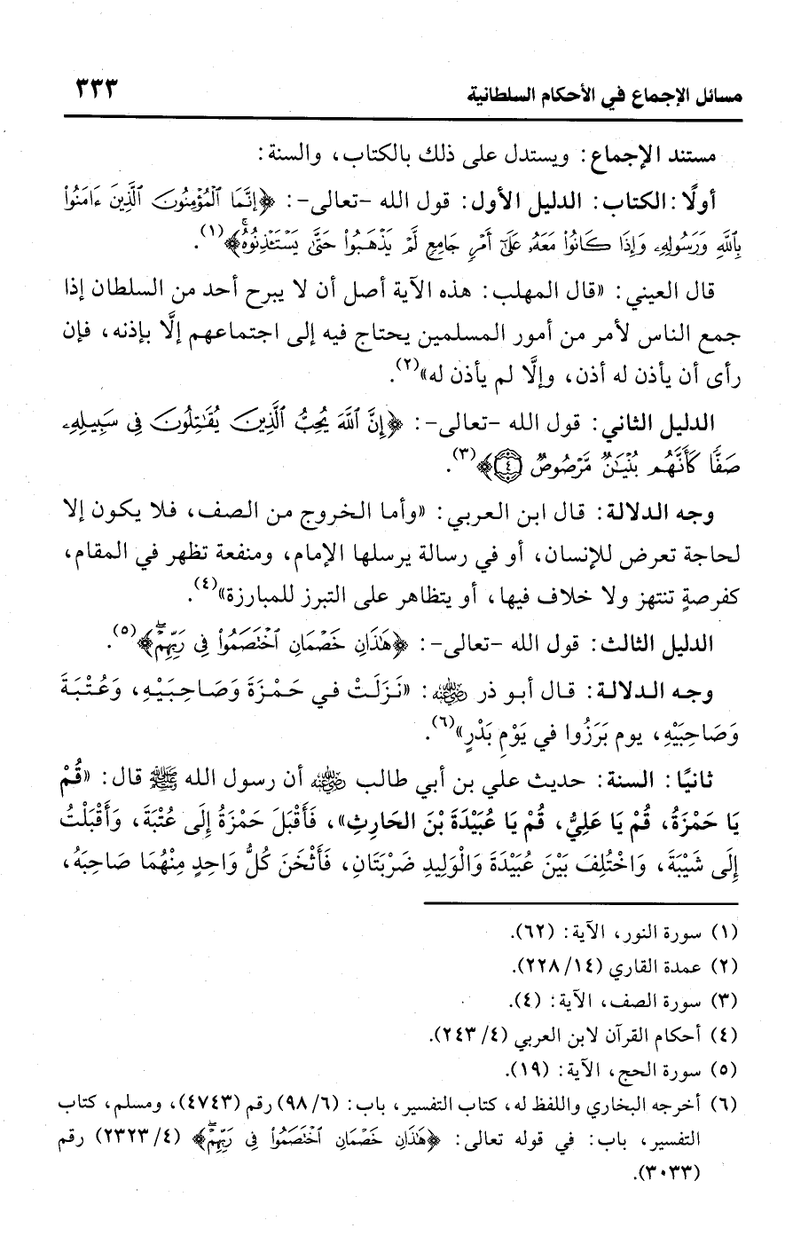 • أولًا: الكتاب: الدليل الأول: قول اللَّه -تعالى-: {إِنَّمَا الْمُؤْمِنُونَ الَّذِينَ آمَنُوا بِاللَّهِ وَرَسُولِهِ وَإِذَا كَانُوا مَعَهُ عَلَى أَمْرٍ جَامِعٍ لَمْ يَذْهَبُوا حَتَّى يَسْتَأْذِنُوهُ} (¬1).