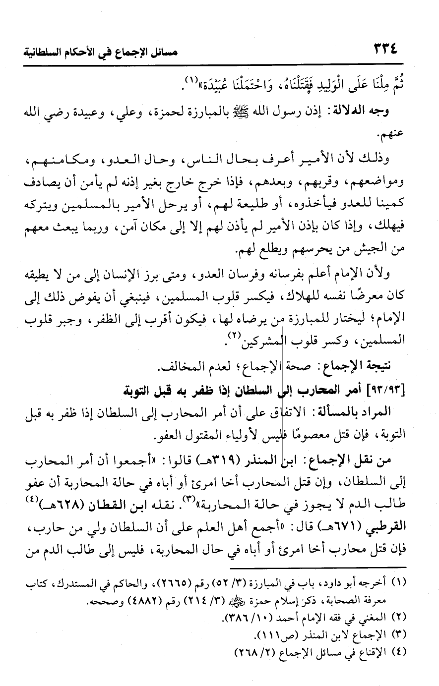 • من نقل الإجماع: ابن المنذر (319 هـ) قالوا: "أجمعوا أن أمر المحارب إلى السلطان، وإن قتل المحارب أخا امرئ أو أباه في حالة المحاربة أن عفو طالب الدم لا يجوز في حالة المحاربة" (¬3). نقله ابن القطان (628 هـ) (¬4) القرطبي (671 هـ) قال: "أجمع أهل العلم على أن السلطان ولي من حارب، فإن قتل محارب أخا امرئ أو أباه في حال المحاربة، فليس إلى طالب الدم من
