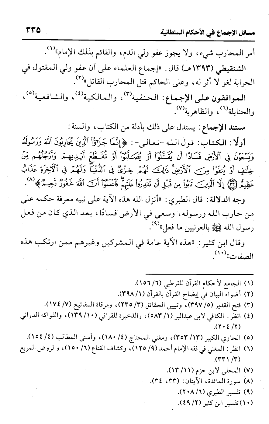 الشنقيطي (1393 هـ) قال: "إجماع العلماء على أن عفو ولي المقتول في الحرابة لغو لا أثر له، وعلى الحاكم قتل المحارب القاتل" (¬2).