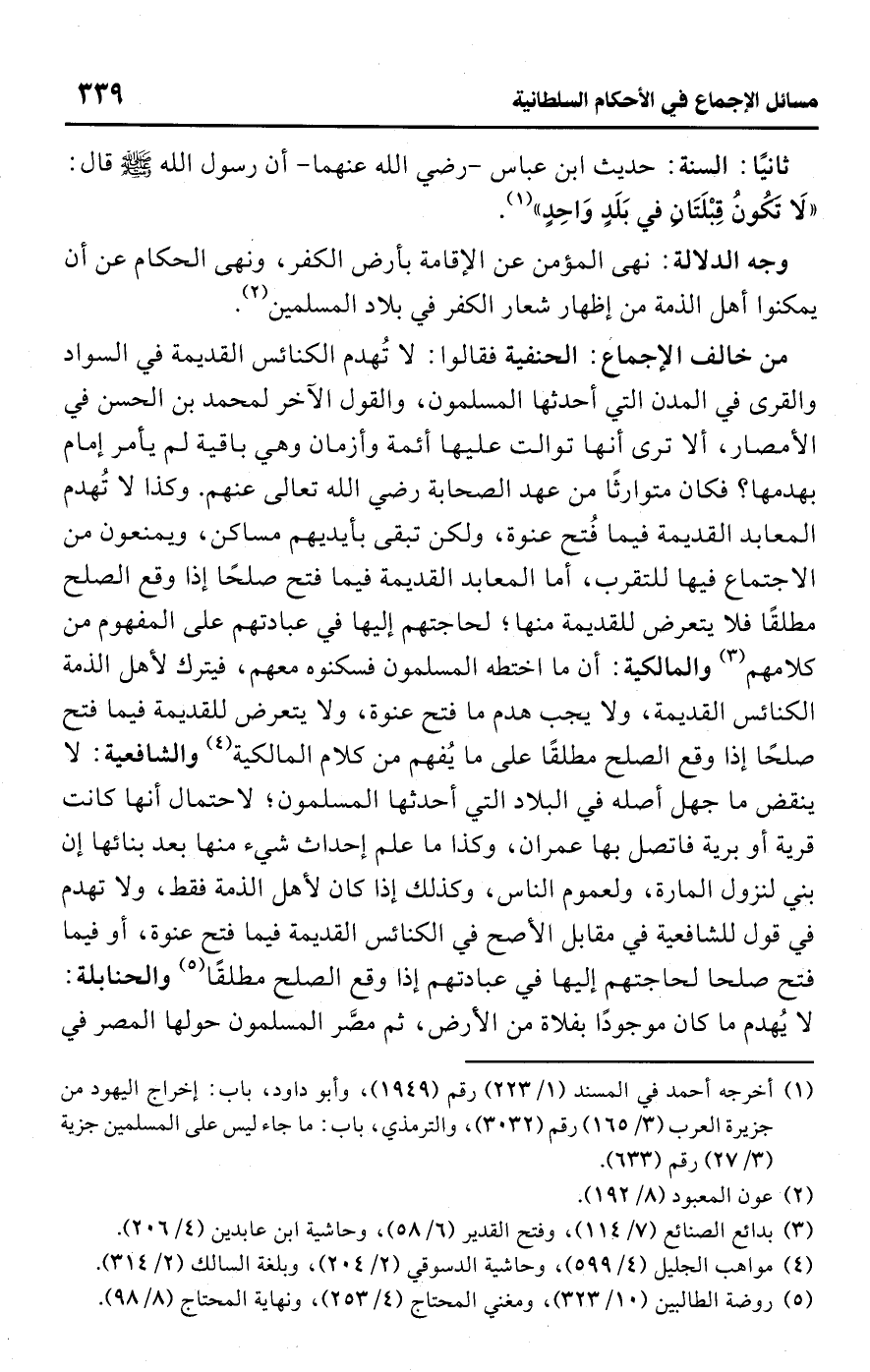• ثانيًا: السنة: حديث ابن عباس -رضي اللَّه عنهما- أن رسول اللَّه -صلى اللَّه عليه وسلم- قال: "لَا تَكُونُ قِبْلَتَانِ في بَلَدٍ وَاحِدٍ" (¬1).