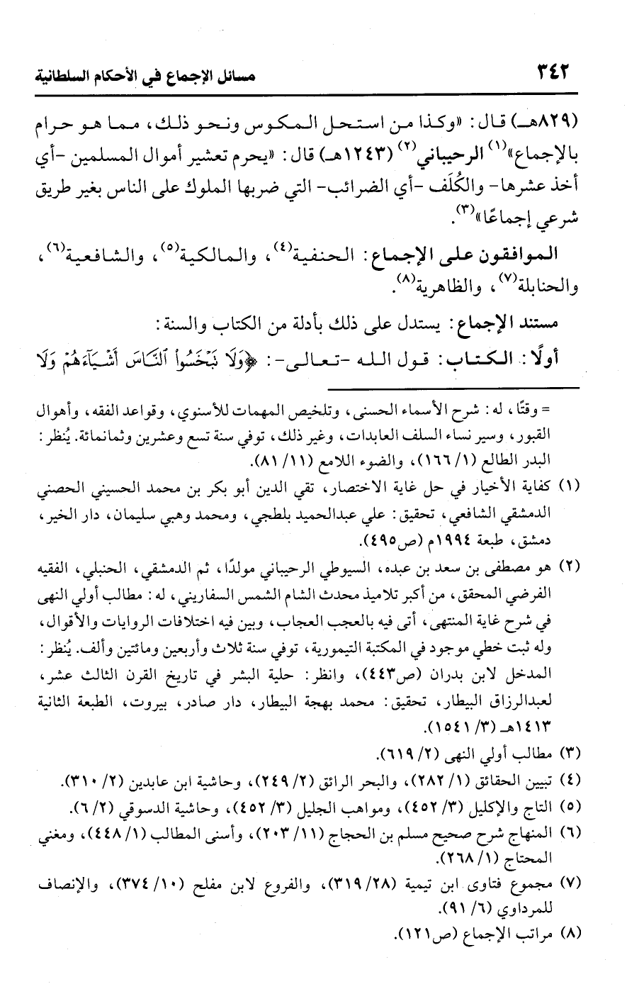 قال: "وكذا من استحل المكوس ونحو ذلك، مما هو حرام بالإجماع" (¬1) الرحيباني (¬2) (1243 هـ) قال: "يحرم تعشير أموال المسلمين -أي أخذ عشرها- والكُلَف -أي الضرائب- التي ضربها الملوك على الناس بغير طريق شرعي إجماعًا" (¬3).