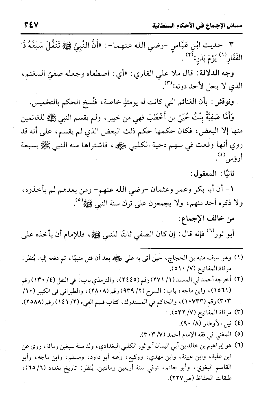• من خالف الإجماع: أبو ثور (¬6) فإنه قال: إن كان الصفي ثابتًا للنبي -صلى اللَّه عليه وسلم-، فللإمام أن يأخذه على