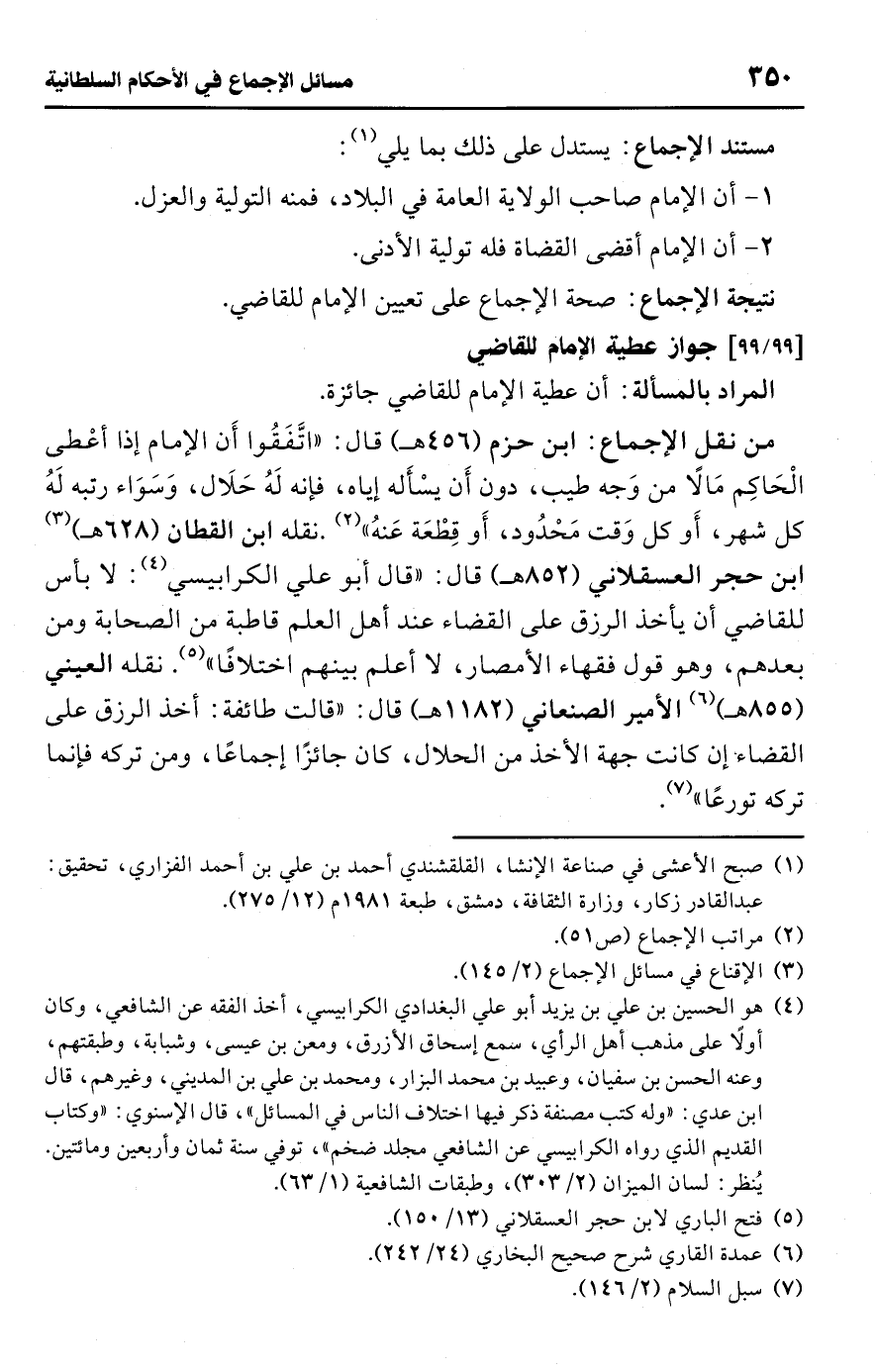 • من نقل الإجماع: ابن حزم (456 هـ) قال: "اتَّفَقُوا أَن الإمام إذا أعْطى الْحَاكِم مَالًا من وَجه طيب، دون أَن يسْأَله إياه، فإنه لَهُ حَلَال، وَسَوَاء رتبه لَهُ كل شهر، أَو كل وَقت مَحْدُود، أَو قِطْعَة عَنهُ" (¬2). نقله ابن القطان (628 هـ) (¬3) ابن حجر العسقلاني (852 هـ) قال: "قال أبو علي الكرابيسي (¬4): لا بأس للقاضي أن يأخذ الرزق على القضاء عند أهل العلم قاطبة من الصحابة ومن بعدهم، وهو قول فقهاء الأمصار، لا أعلم بينهم اختلافًا" (¬5). نقله العيني (855 هـ) (¬6) الأمير الصنعاني (1182 هـ) قال: "قالت طائفة: أخذ الرزق على القضاء إن كانت جهة الأخذ من الحلال، كان جائزًا إجماعًا، ومن تركه فإنما تركه تورعًا" (¬7).
