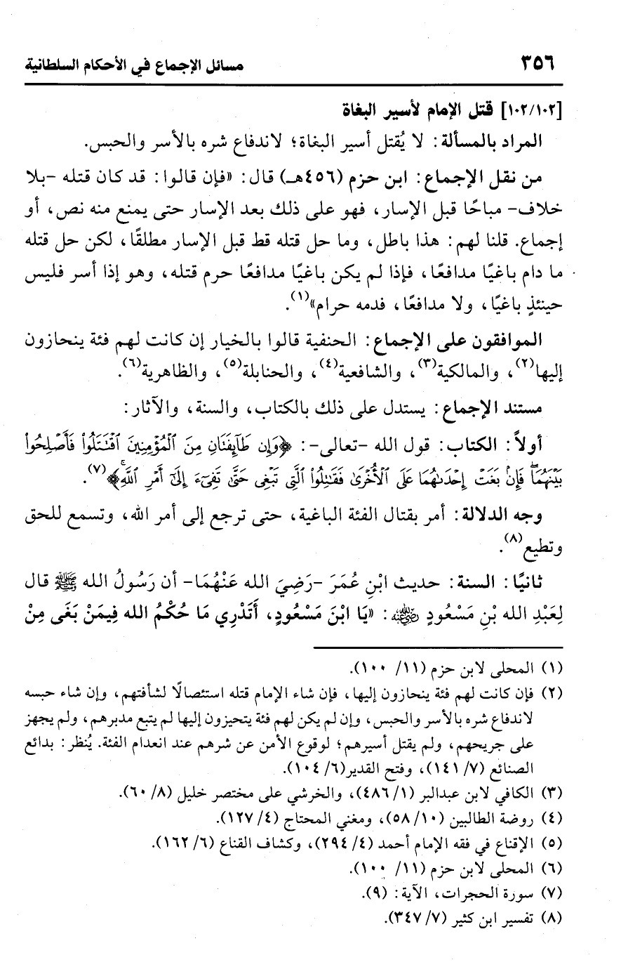 • من نقل الإجماع: ابن حزم (456 هـ) قال: "فإن قالوا: قد كان قتله -بلا خلاف- مباحًا قبل الإسار، فهو على ذلك بعد الإسار حتى يمنع منه نص، أو إجماع. قلنا لهم: هذا باطل، وما حل قتله قط قبل الإسار مطلقًا، لكن حل قتله. ما دام باغيًا مدافعًا، فإذا لم يكن باغيًا مدافعًا حرم قتله، وهو إذا أسر فليس حينئذٍ باغيًا، ولا مدافعًا، فدمه حرام" (¬1).