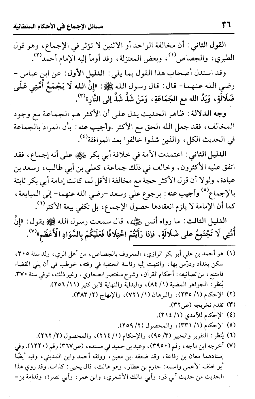 • وجه الدلالة: ظاهر الحديث يدل على أن الأكثر هم الجماعة مع وجود المخالف، فقد جعل اللَّه الحق مع الأكثر. وأجيب عنه: بأن المراد بالجماعة في الحديث الكل، والذين شذوا خالفوا بعد الموافقة (¬4).