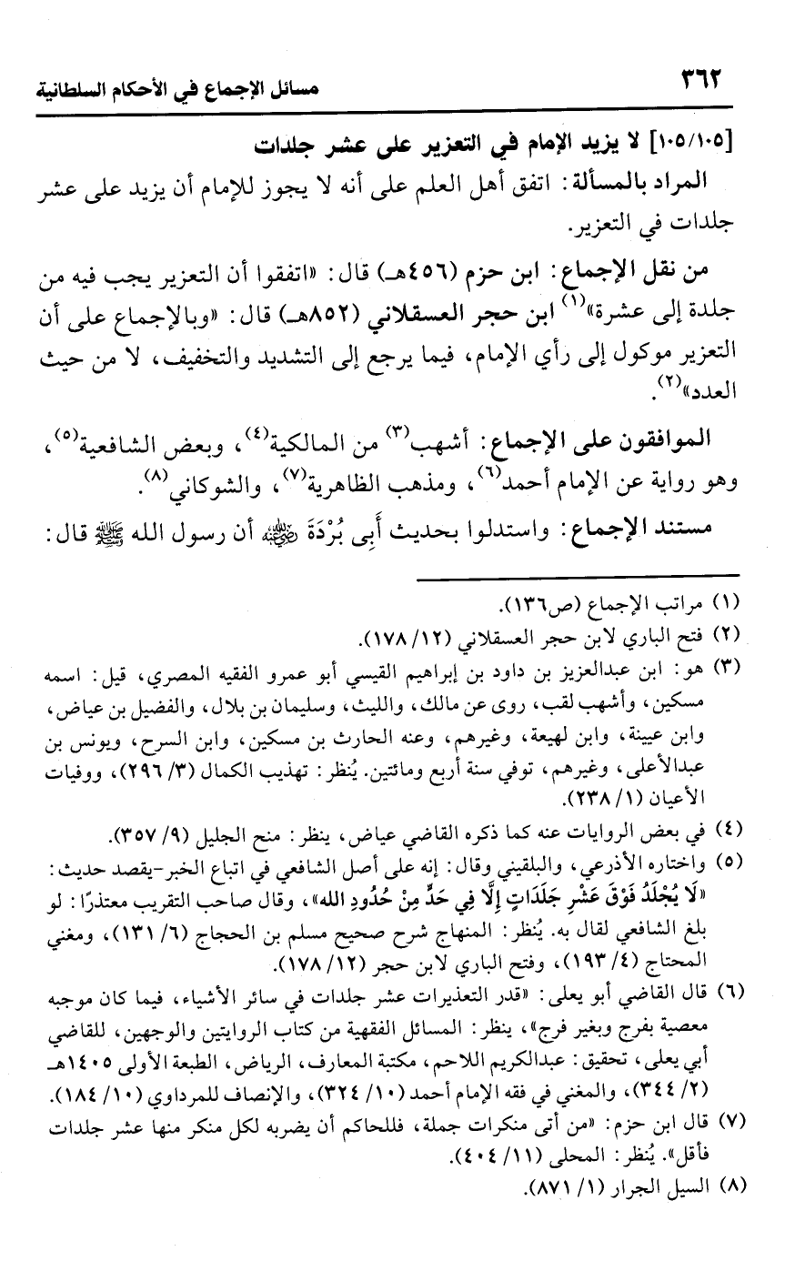 • من نقل الإجماع: ابن حزم (456 هـ) قال: "اتفقوا أن التعزير يجب فيه من جلدة إلى عشرة" (¬1) ابن حجر العسقلاني (852 هـ) قال: "وبالإجماع على أن التعزير موكول إلى رأي الإمام، فيما يرجع إلى التشديد والتخفيف، لا من حيث العدد" (¬2).