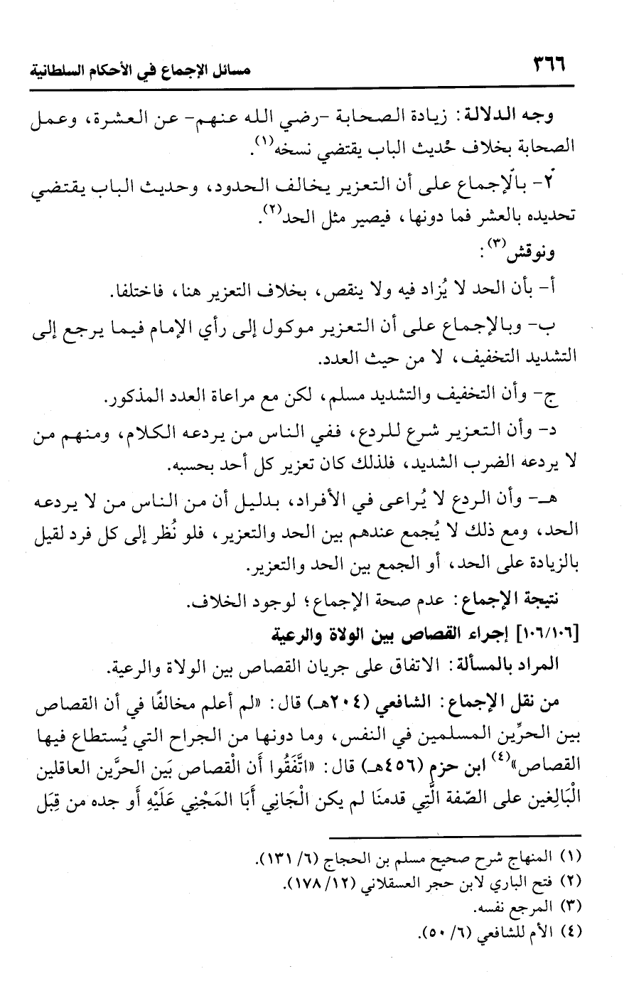 • من نقل الإجماع: الشافعي (204 هـ) قال: "لم أعلم مخالفًا في أن القصاص بين الحرِّين المسلمين في النفس، وما دونها من الجراح التي يُستطاع فيها القصاص" (¬4) ابن حزم (456 هـ) قال: "اتَّفَقُوا أَن الْقصاص بَين الحرَّين العاقلين الْبَالِغين على الصّفة الَّتِي قدمنَا لم يكن الْجَانِي أَبَا المَجْنِي عَلَيْهِ أَو جده من قِبَل