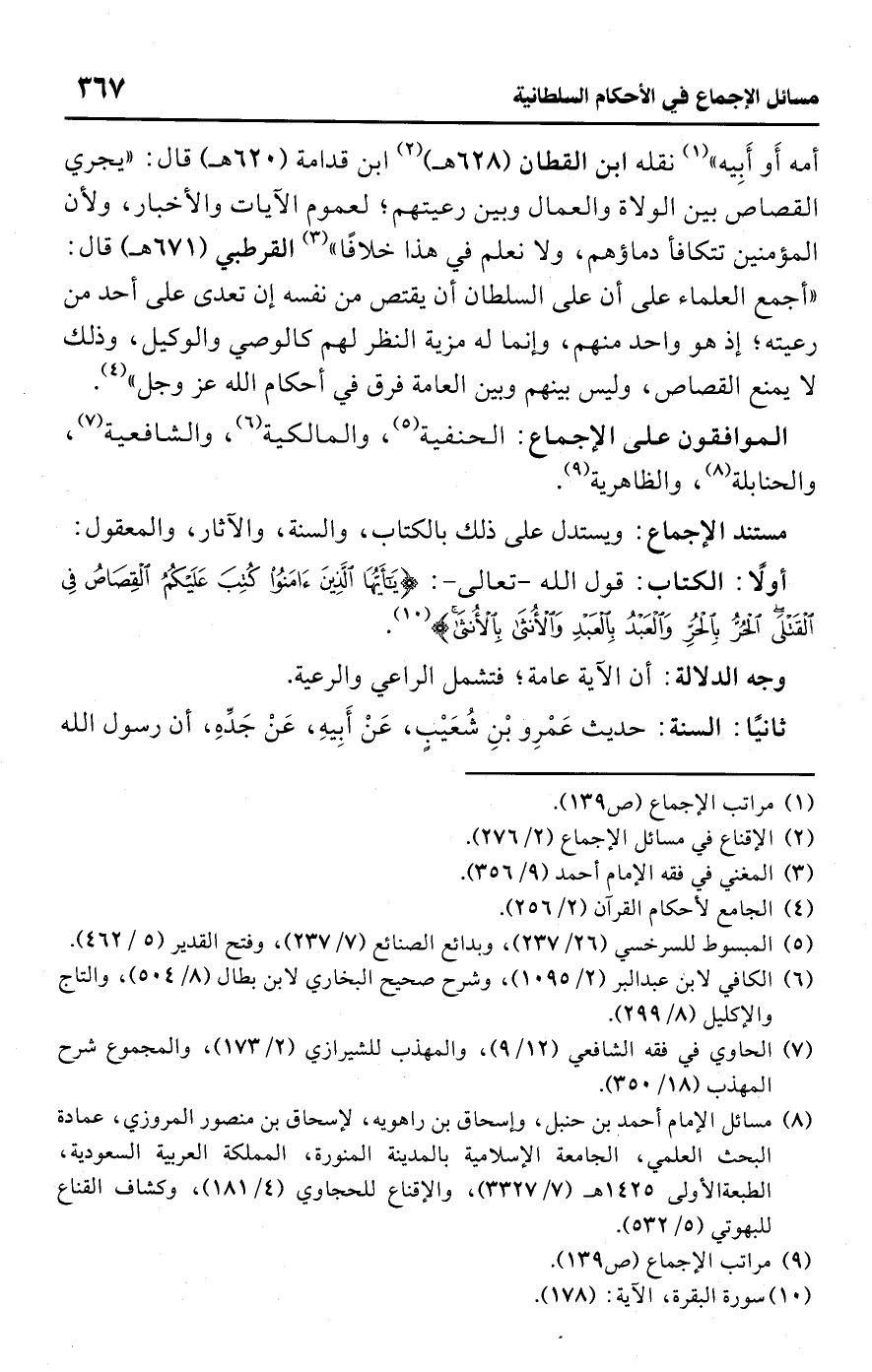 أمه أَو أَبِيه" (¬1) نقله ابن القطان (628 هـ) (¬2) ابن قدامة (620 هـ) قال: "يجري القصاص بين الولاة والعمال وبين رعيتهم؛ لعموم الآيات والأخبار، ولأن المؤمنين تتكافأ دماؤهم، ولا نعلم في هذا خلافًا" (¬3) القرطبي (671 هـ) قال: "أجمع العلماء على أن على السلطان أن يقتص من نفسه إن تعدى على أحد من رعيته؛ إذ هو واحد منهم، وإنما له مزية النظر لهم كالوصي والوكيل، وذلك لا يمنع القصاص، وليس بينهم وبين العامة فرق في أحكام اللَّه عز وجل" (¬4).
