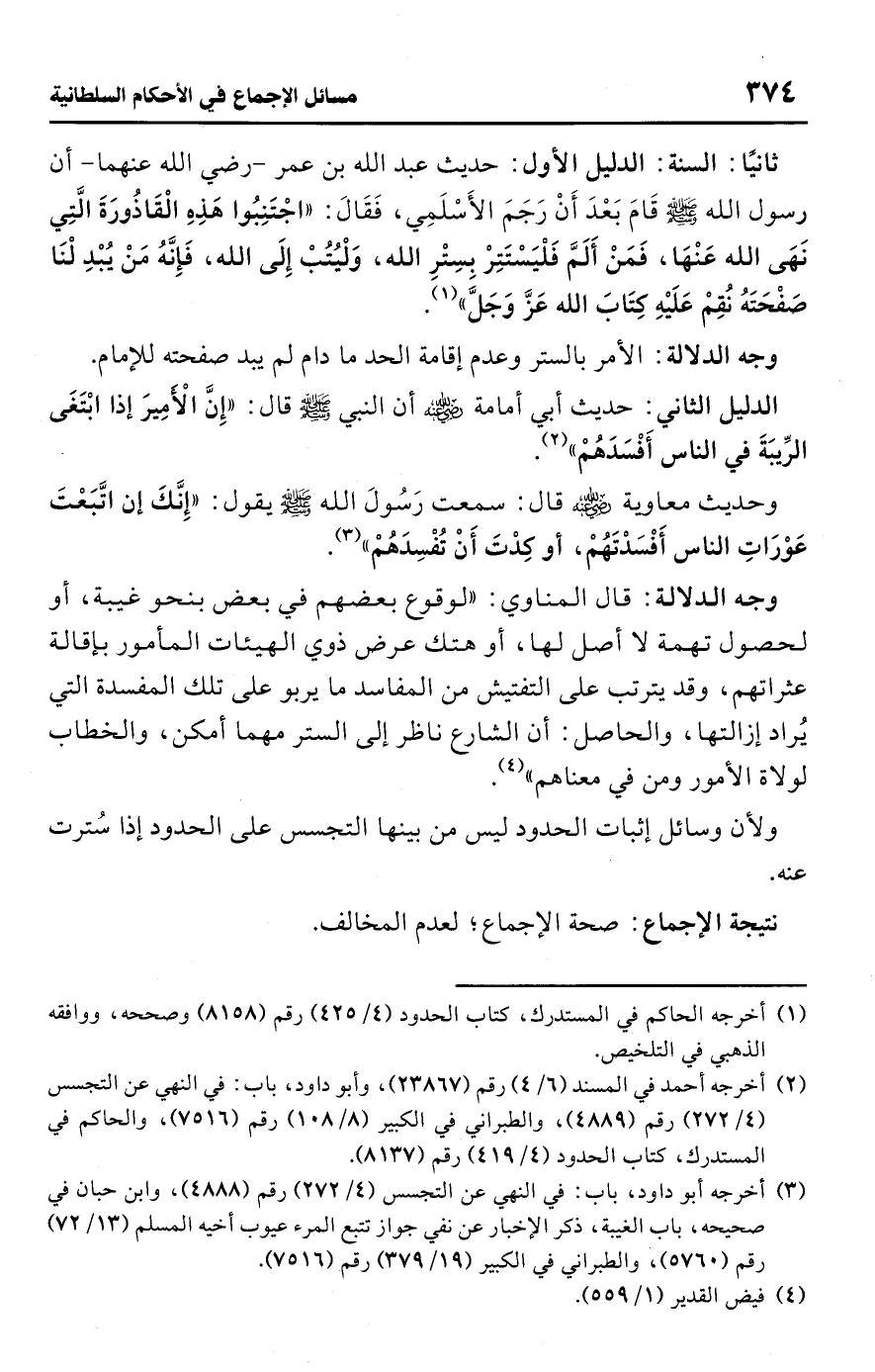 ولأن وسائل إثبات الحدود ليس من بينها التجسس على الحدود إذا سُترت عنه.Rصحة الإجماع، لعدم المخالف.