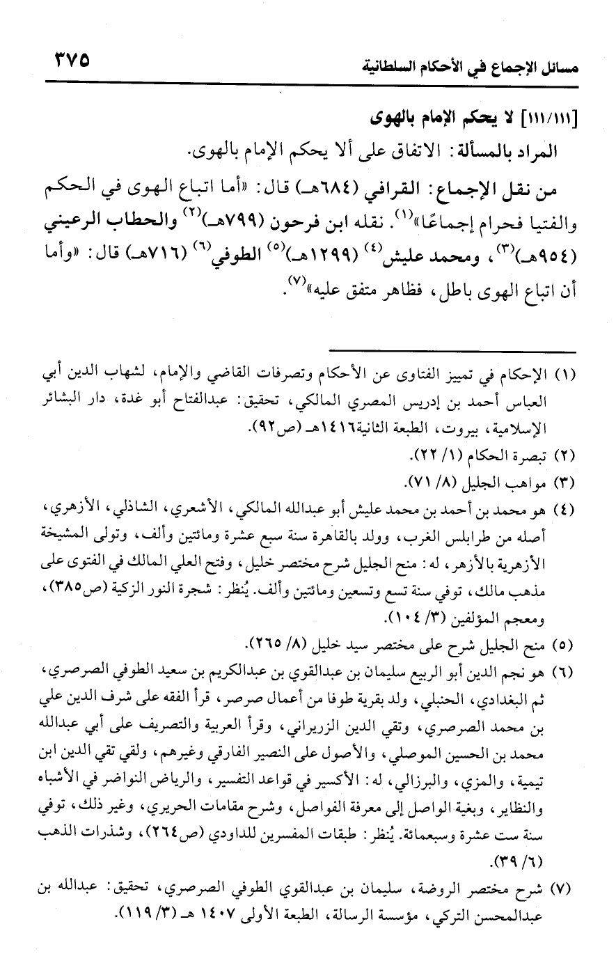 • من نقل الإجماع: القرافي (684 هـ) قال: "أما اتباع الهوى في الحكم والفتيا فحرام إجماعًا" (¬1). نقله ابن فرحون (799 هـ) (¬2) والحطاب الرعيني (954 هـ) (¬3)، ومحمد عليش (¬4) (1299 هـ) (¬5) الطوفي (¬6) (716 هـ) قال: "وأما أن اتباع الهوى باطل، فظاهر متفق عليه" (¬7).
