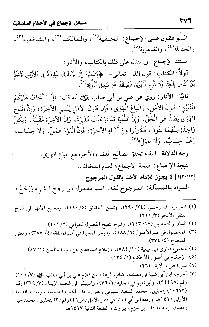 • أولًا: الكتاب: قول اللَّه -تعالى-: {يَادَاوُودُ إِنَّا جَعَلْنَاكَ خَلِيفَةً فِي الْأَرْضِ فَاحْكُمْ بَيْنَ النَّاسِ بِالْحَقِّ وَلَا تَتَّبِعِ الْهَوَى فَيُضِلَّكَ عَنْ سَبِيلِ اللَّهِ} (¬6).
