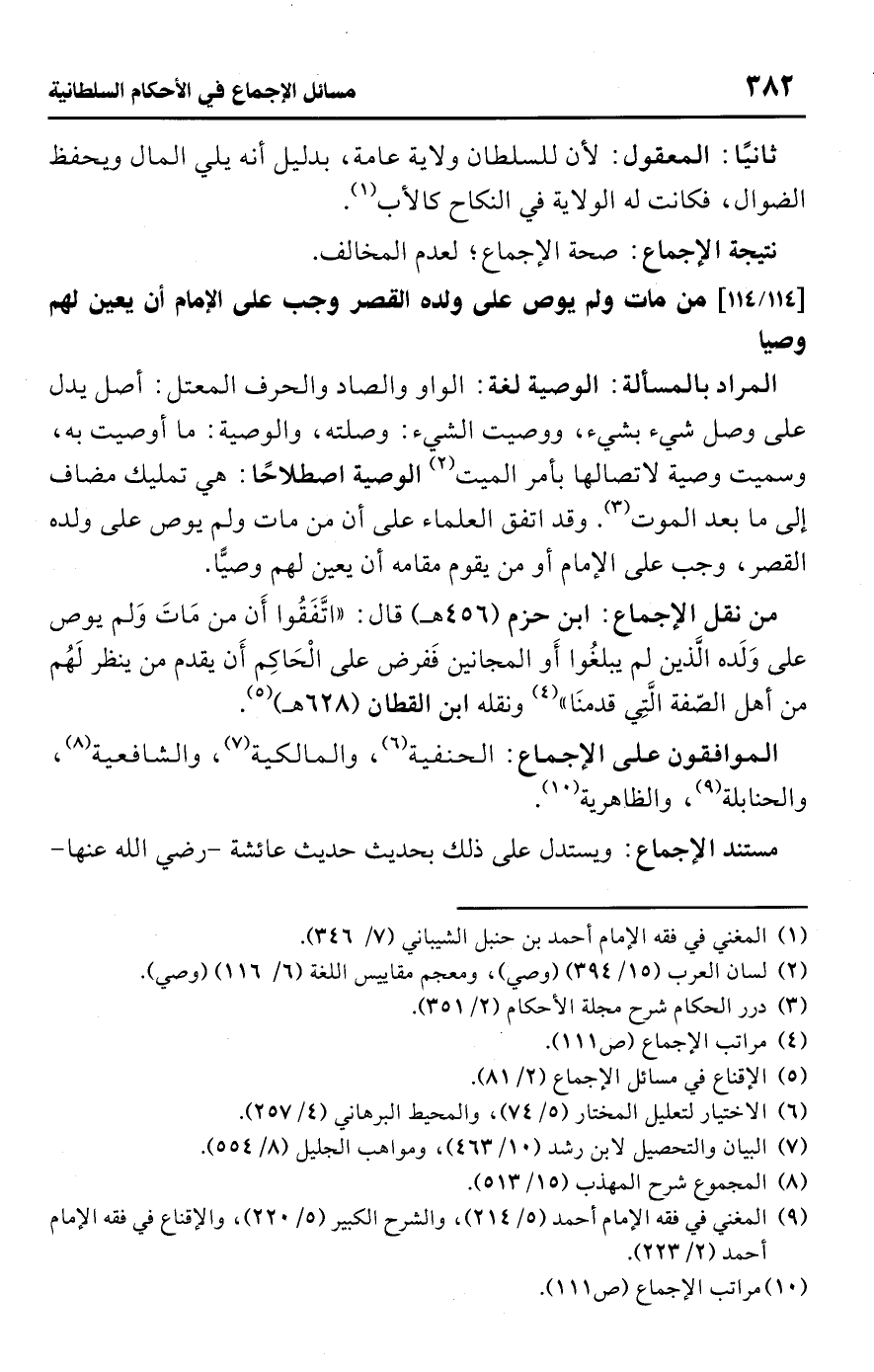 • المراد بالمسألة: الوصية لغة: الواو والصاد والحرف المعتل: أصل يدل على وصل شيء بشيء، ووصيت الشيء: وصلته، والوصية: ما أوصيت به، وسميت وصية لاتصالها بأمر الميت (¬2) الوصية اصطلاحًا: هي تمليك مضاف إلى ما بعد الموت (¬3). وقد اتفق العلماء على أن من مات ولم يوص على ولده القصر، وجب على الإمام أو من يقوم مقامه أن يعين لهم وصيًّا.