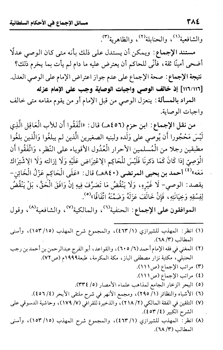 • من نقل الإجماع: ابن حزم (456 هـ) قال: "اتَّفَقُوا أَن للأب الْعَاقِل الَّذِي لَيْسَ مَحْجُورا أَن يُوصي على وَلَده ولبنيه الصغيرين الَّذين لم يبلغُوا وَالَّذين بلغُوا مطبقين رجلا من الْمُسلمين الأحرار الْعُدُول الأقوياء على النّظر، وَاتَّفَقُوا أَن الْوَصِيّ إذا كَانَ كَمَا ذكرنَا فَلَيْسَ للْحَاكِم الِاعْتِرَاض عَلَيْهِ وَلَا إزالته وَلَا الِاشْتِرَاك مَعَه" (¬4) أحمد بن يحيى المرتضى (840 هـ) قال: "عَلَى الْحَاكِمِ عَزْلُ الْخَائِنِ -يقصد: الوصي- لَا غَيْرِهِ، وَلَا يَنْقُضُ مَا تَصَرَّفَ فِيهِ إنْ وَافَقَ الْحَقَّ، بَلْ يَنْقُضُ لِفِسْقِهِ وَخِيَانَتِهِ، فَإِنْ خَالَفَ عَزَلَهُ وَضَمَّنَهُ اتَفَاقًا" (¬5).