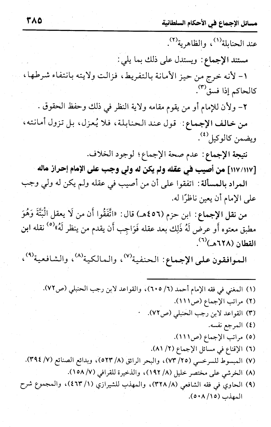 • من نقل الإجماع: ابن حزم (456 هـ) قال: "اتَّفَقُوا أَن من لَا يعقل الْبَتَّةَ وَهُوَ مطبق معتوه أَو عرض لَهُ ذَلِك بعد عقله فَوَاجِب أَن يقدم من ينظر لَهُ" (¬5) نقله ابن القطان (628 هـ) (¬6).