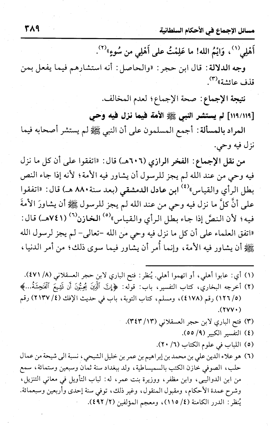 • من نقل الإجماع: الفخر الرازي (606 هـ) قال: "اتفقوا على أن كل ما نزل فيه وحي من عند اللَّه لم يجز للرسول أن يشاور فيه الأمة؛ لأنه إذا جاء النص بطل الرأي والقياس" (¬4) ابن عادل الدمشقي (بعد سنة 880 هـ) قال: "اتفقوا على أن كلَّ ما نزل فيه وحي من عند اللَّه لم يجز للرسول -صلى اللَّه عليه وسلم- أن يشاورَ الأمةَ فيه؛ لأن النصَّ إذا جاء بطل الرأي والقياس" (¬5) الخازن (¬6) (741 هـ) قال: "اتفق العلماء على أن كل ما نزل فيه وحي من اللَّه -تعالى- لم يجز لرسول اللَّه -صلى اللَّه عليه وسلم- أن يشاور فيه الأمة، وإنما أُمر أن يشاور فيما سوى ذلك؛ من أمر الدنيا،