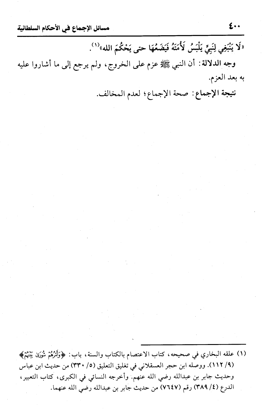 • وجه الدلالة: أن النبي -صلى اللَّه عليه وسلم- عزم على الخروج، ولم يرجع إلى ما أشاروا عليه به بعد العزم.Rصحة الإجماع؛ لعدم المخالف.