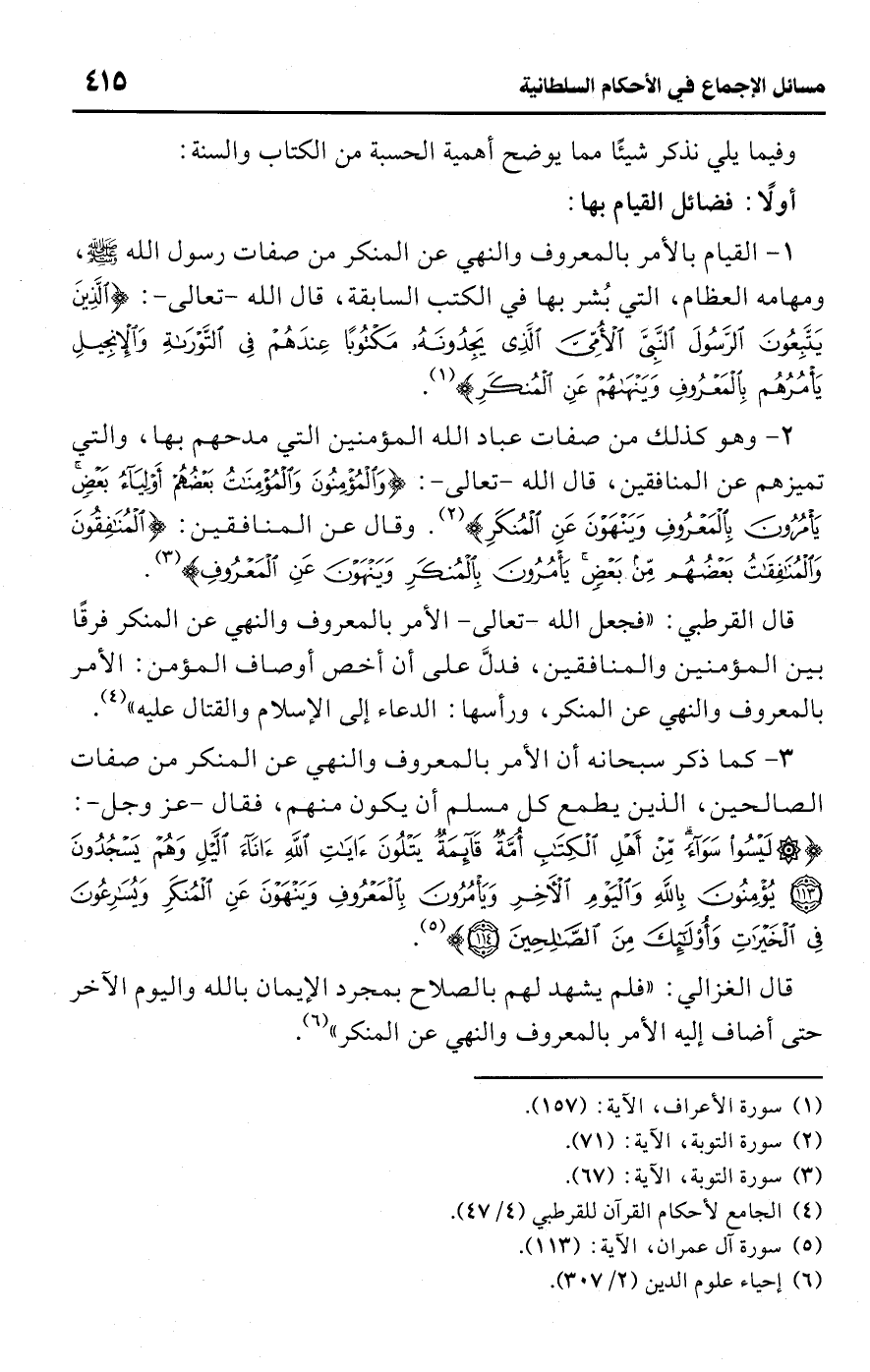 قال الغزالي: "فلم يشهد لهم بالصلاح بمجرد الإيمان باللَّه واليوم الآخر حتى أضاف إليه الأمر بالمعروف والنهي عن المنكر" (¬6).