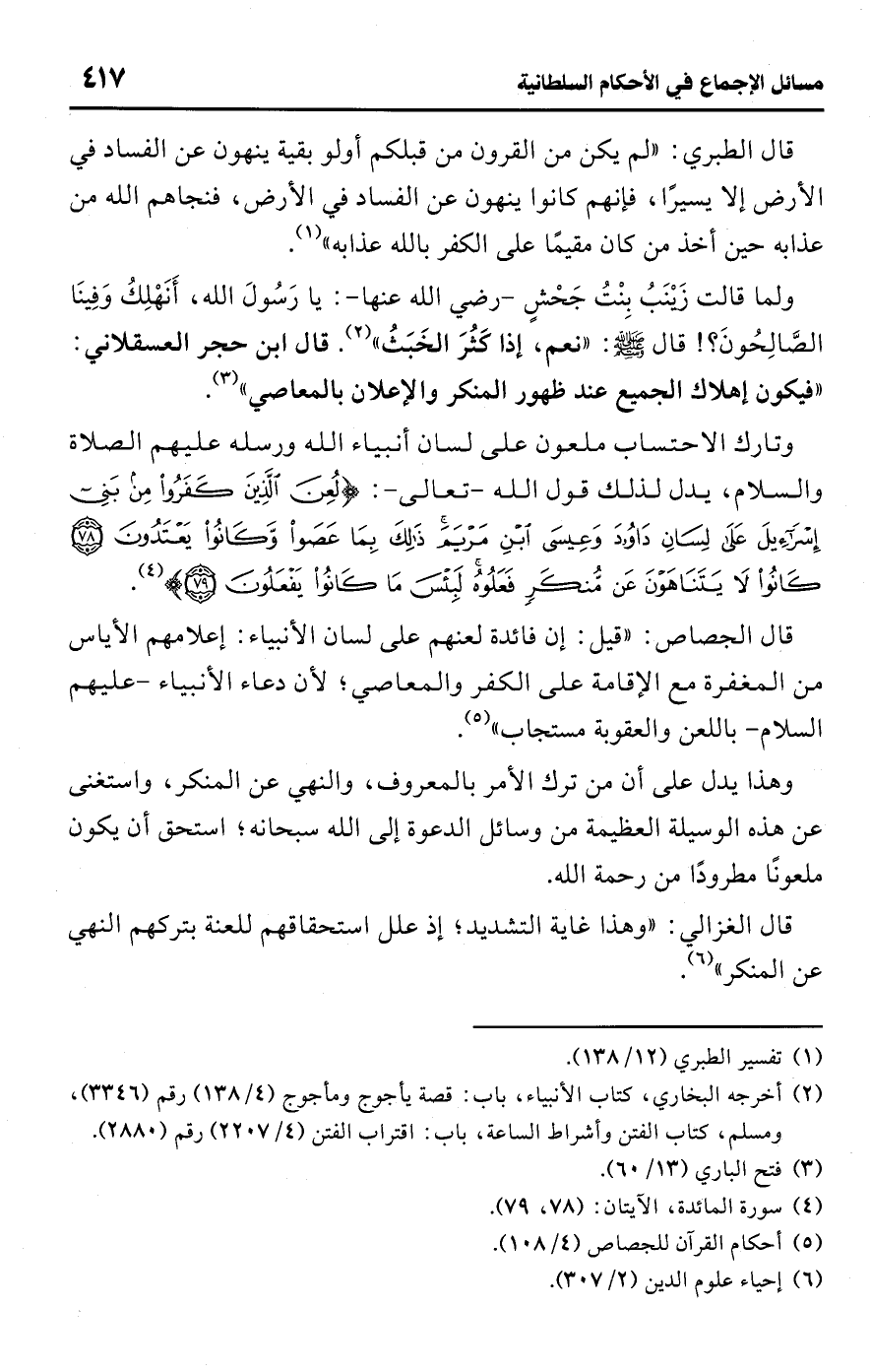 قال الغزالي: "وهذا غاية التشديد؛ إذ علل استحقاقهم للعنة بتركهم النهي عن المنكر" (¬6).