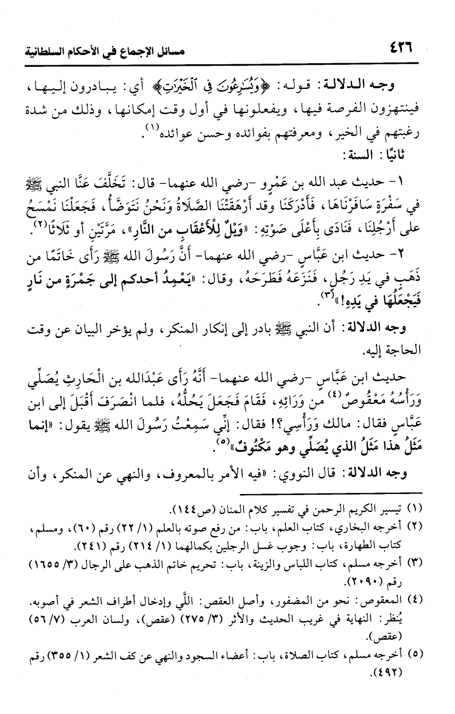 1 - حديث عبد اللَّه بن عَمْرٍو -رضي اللَّه عنهما- قال: تَخَلَّفَ عَنَّا النبي -صلى اللَّه عليه وسلم- في سَفْرَةٍ سَافَرْنَاهَا، فَأَدْرَكَنَا وقد أَرْهَقَتْنَا الصَّلَاةُ وَنَحْنُ نَتَوَضَّأُ، فَجَعَلْنَا نَمْسَحُ على أَرْجُلِنَا، فَنَادَى بِأَعْلَى صَوْتِهِ: "وَيْلٌ لِلأعْقَابِ من النَّارِ"، مَرَّتَيْنِ أو ثَلَاثًا (¬2).