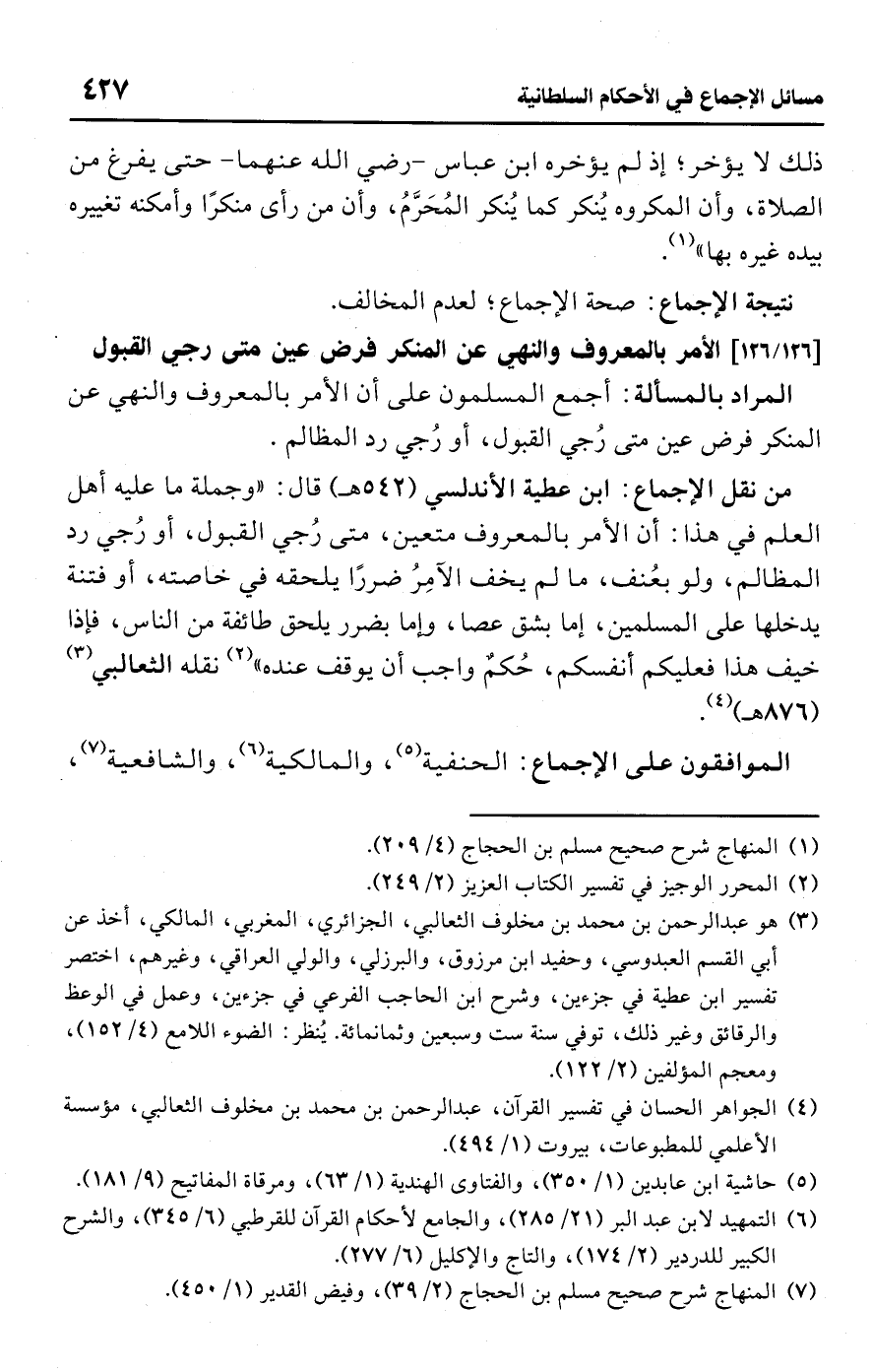• من نقل الإجماع: ابن عطية الأندلسي (542 هـ) قال: "وجملة ما عليه أهل العلم في هذا: أن الأمر بالمعروف متعين، متى رُجي القبول، أو رُجي رد المظالم، ولو بعُنف، ما لم يخف الآمِرُ ضررًا يلحقه في خاصته، أو فتنة يدخلها على المسلمين، إما بشق عصا، وإما بضرر يلحق طائفة من الناس، فإذا خيف هذا فعليكم أنفسكم، حُكمٌ واجب أن يوقف عنده" (¬2) نقله الثعالبي (¬3) (876 هـ) (¬4).