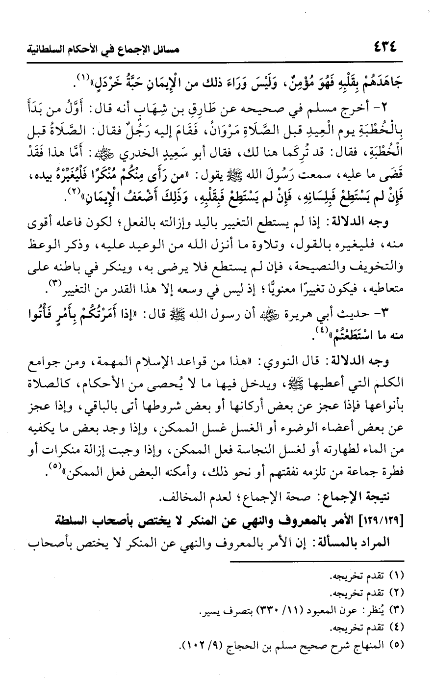 • وجه الدلالة: قال النووي: "هذا من قواعد الإسلام المهمة، ومن جوامع الكلم التي أعطيها -صلى اللَّه عليه وسلم-، ويدخل فيها ما لا يُحصى من الأحكام، كالصلاة بأنواعها فإذا عجز عن بعض أركانها أو بعض شروطها أتى بالباقي، وإذا عجز عن بعض أعضاء الوضوء أو الغسل غسل الممكن، وإذا وجد بعض ما يكفيه من الماء لطهارته أو لغسل النجاسة فعل الممكن، وإذا وجبت إزالة منكرات أو فطرة جماعة من تلزمه نفقتهم أو نحو ذلك، وأمكنه البعض فعل الممكن" (¬5).Rصحة الإجماع؛ لعدم المخالف.