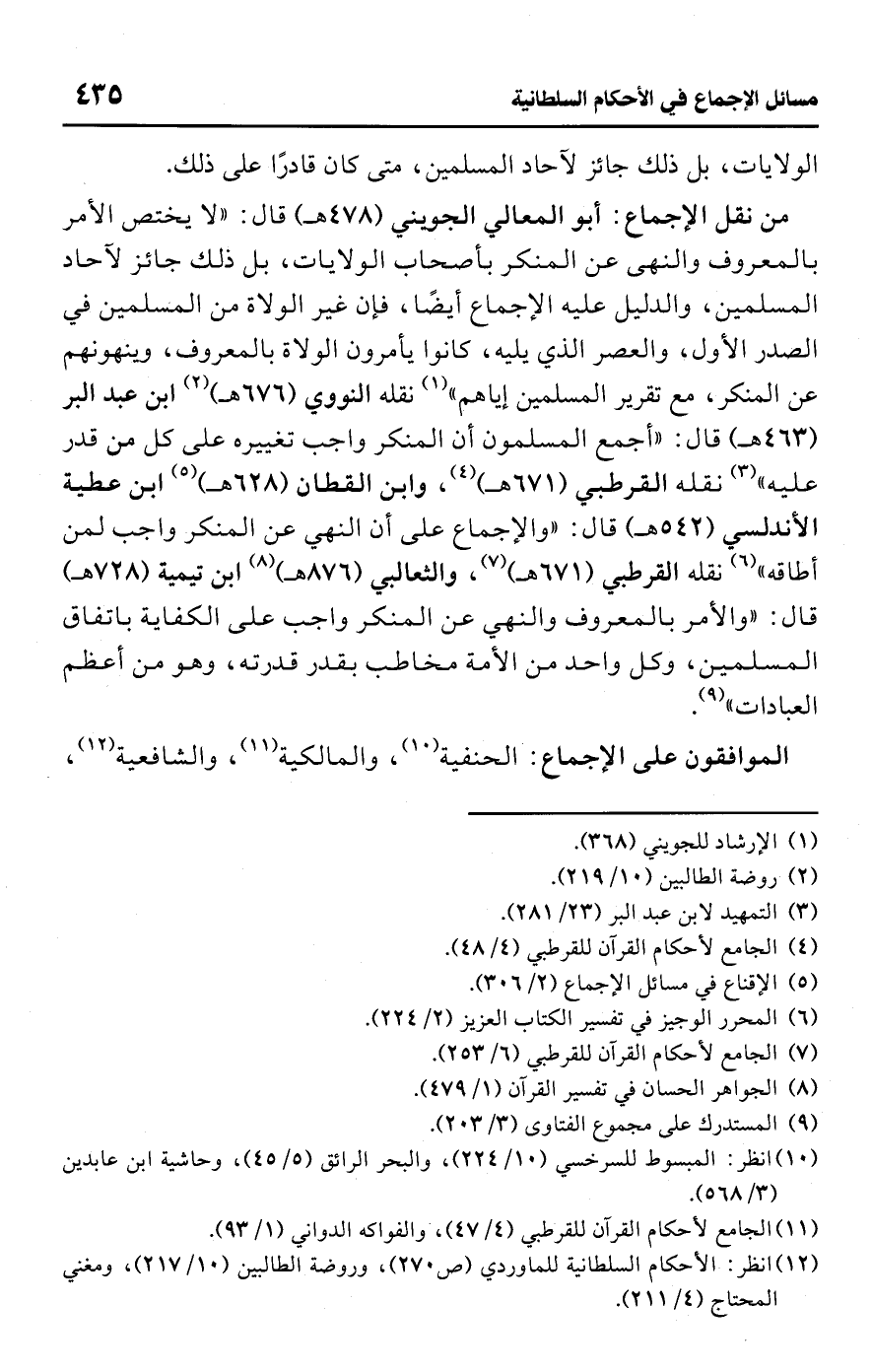 • من نقل الإجماع: أبو المعالي الجويني (478 هـ) قال: "لا يختص الأمر بالمعروف والنهى عن المنكر بأصحاب الولايات، بل ذلك جائز لآحاد المسلمين، والدليل عليه الإجماع أيضًا، فإن غير الولاة من المسلمين في الصدر الأول، والعصر الذي يليه، كانوا يأمرون الولاة بالمعروف، وينهونهم عن المنكر، مع تقرير المسلمين إياهم" (¬1) نقله النووي (676 هـ) (¬2) ابن عبد البر (463 هـ) قال: "أجمع المسلمون أن المنكر واجب تغييره على كل من قدر عليه" (¬3) نقله القرطبي (671 هـ) (¬4)، وابن القطان (628 هـ) (¬5) ابن عطية الأندلسي (542 هـ) قال: "والإجماع على أن النهي عن المنكر واجب لمن أطاقه" (¬6) نقله القرطبي (671 هـ) (¬7)، والثعالبي (876 هـ) (¬8) ابن تيمية (728 هـ) قال: "والأمر بالمعروف والنهي عن المنكر واجب على الكفاية باتفاق المسلمين، وكل واحد من الأمة مخاطب بقدر قدرته، وهو من أعظم العبادات" (¬9).