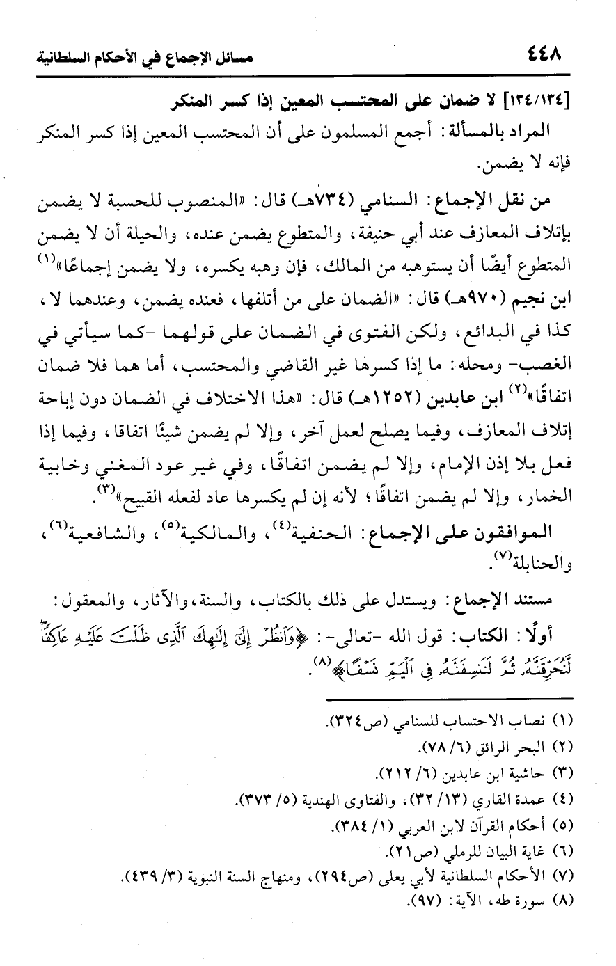 • من نقل الإجماع: السنامي (734 هـ) قال: "المنصوب للحسبة لا يضمن بإتلاف المعازف عند أبي حنيفة، والمتطوع يضمن عنده، والحيلة أن لا يضمن المتطوع أيضًا أن يستوهبه من المالك، فإن وهبه يكسره، ولا يضمن إجماعًا" (¬1) ابن نجيم (970 هـ) قال: "الضمان على من أتلفها، فعنده يضمن، وعندهما لا، كذا في البدائع، ولكن الفتوى في الضمان على قولهما -كما سيأتي في الغصب- ومحله: ما إذا كسرها غير القاضي والمحتسب، أما هما فلا ضمان اتفاقًا" (¬2) ابن عابدين (1252 هـ) قال: "هذا الاختلاف في الضمان دون إباحة إتلاف المعازف، وفيما يصلح لعمل آخر، وإلا لم يضمن شيئًا اتفاقا، وفيما إذا فعل بلا إذن الإمام، وإلا لم يضمن اتفاقًا، وفي غير عود المغني وخابية الخمار، وإلا لم يضمن اتفاقًا؛ لأنه إن لم يكسرها عاد لفعله القبيح" (¬3).