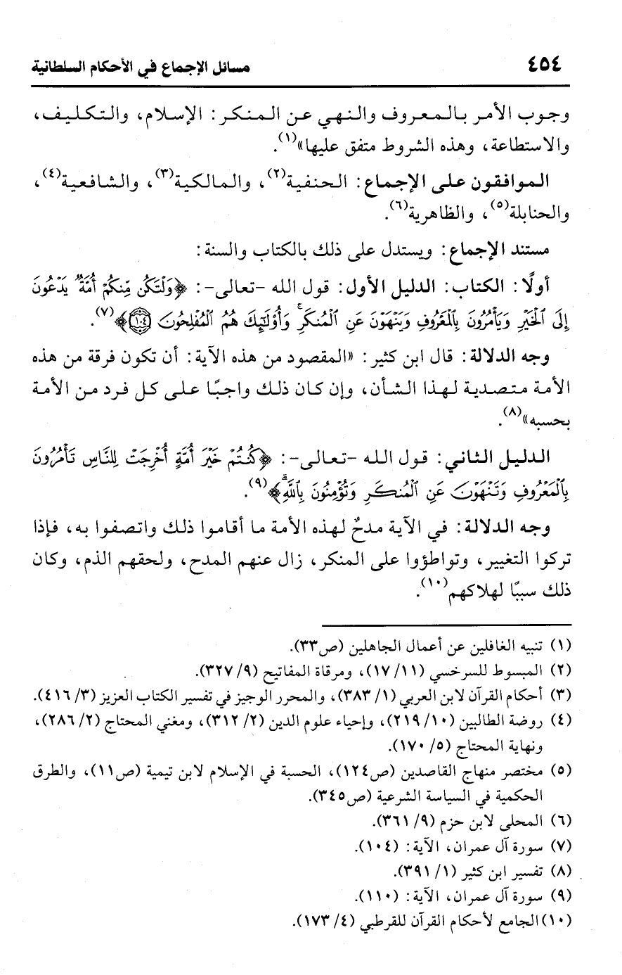 • أولًا: الكتاب: الدليل الأول: قول اللَّه -تعالى-: {وَلْتَكُنْ مِنْكُمْ أُمَّةٌ يَدْعُونَ إِلَى الْخَيْرِ وَيَأْمُرُونَ بِالْمَعْرُوفِ وَيَنْهَوْنَ عَنِ الْمُنْكَرِ وَأُولَئِكَ هُمُ الْمُفْلِحُونَ (104)} (¬7).