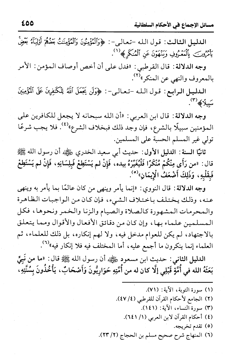 • وجه الدلالة: قال النووي: "إنما يأمر وينهى من كان عالمًا بما يأمر به وينهى عنه، وذلك يختلف باختلاف الشيء، فإن كان من الواجبات الظاهرة والمحرمات المشهورة كالصلاة والصيام والزنا والخمر ونحوها، فكل المسلمين علماء بها، وإن كان من دقائق الأفعال والأقوال ومما يتعلق بالاجتهاد، لم يكن للعوام مدخل فيه، ولا لهم إنكاره، بل ذلك للعلماء، ثم العلماء إنما ينكرون ما أجمع عليه، أما المختلف فيه فلا إنكار فيه" (¬6).