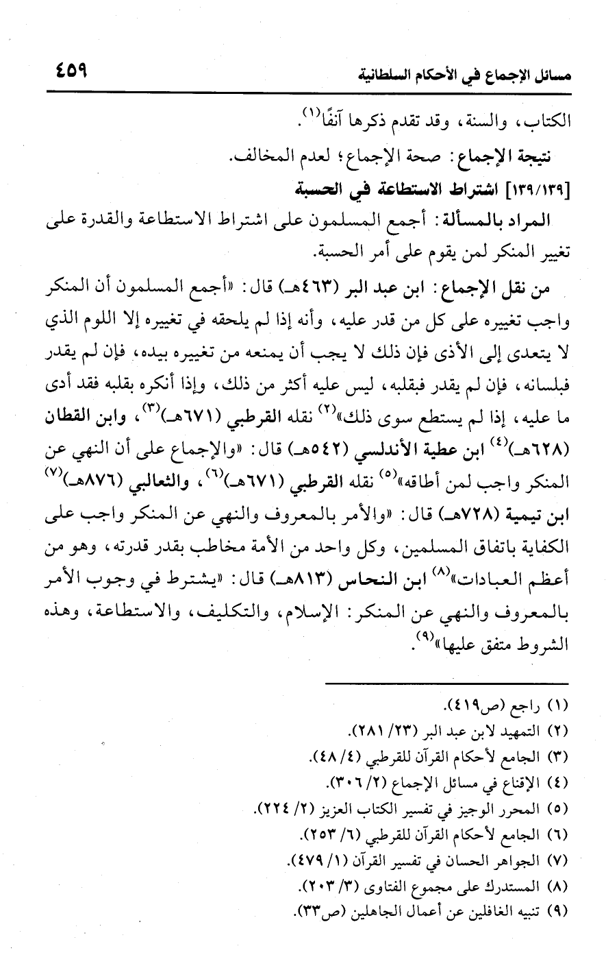 • من نقل الإجماع: ابن عبد البر (463 هـ) قال: "أجمع المسلمون أن المنكر واجب تغييره على كل من قدر عليه، وأنه إذا لم يلحقه في تغييره إلا اللوم الذي لا يتعدى إلى الأذى فإن ذلك لا يجب أن يمنعه من تغييره بيده، فإن لم يقدر فبلسانه، فإن لم يقدر فبقلبه، ليس عليه أكثر من ذلك، وإذا أنكره بقلبه فقد أدى ما عليه، إذا لم يستطع سوى ذلك" (¬2) نقله القرطبي (671 هـ) (¬3)، وابن القطان (628 هـ) (¬4) ابن عطية الأندلسي (542 هـ) قال: "والإجماع على أن النهي عن المنكر واجب لمن أطاقه" (¬5) نقله القرطبي (671 هـ) (¬6)، والثعالبي (876 هـ) (¬7) ابن تيمية (728 هـ) قال: "والأمر بالمعروف والنهي عن المنكر واجب على الكفاية باتفاق المسلمين، وكل واحد من الأمة مخاطب بقدر قدرته، وهو من أعظم العبادات" (¬8) ابن النحاس (813 هـ) قال: "يشترط في وجوب الأمر بالمعروف والنهي عن المنكر: الإسلام، والتكليف، والاستطاعة، وهذه الشروط متفق عليها" (¬9).