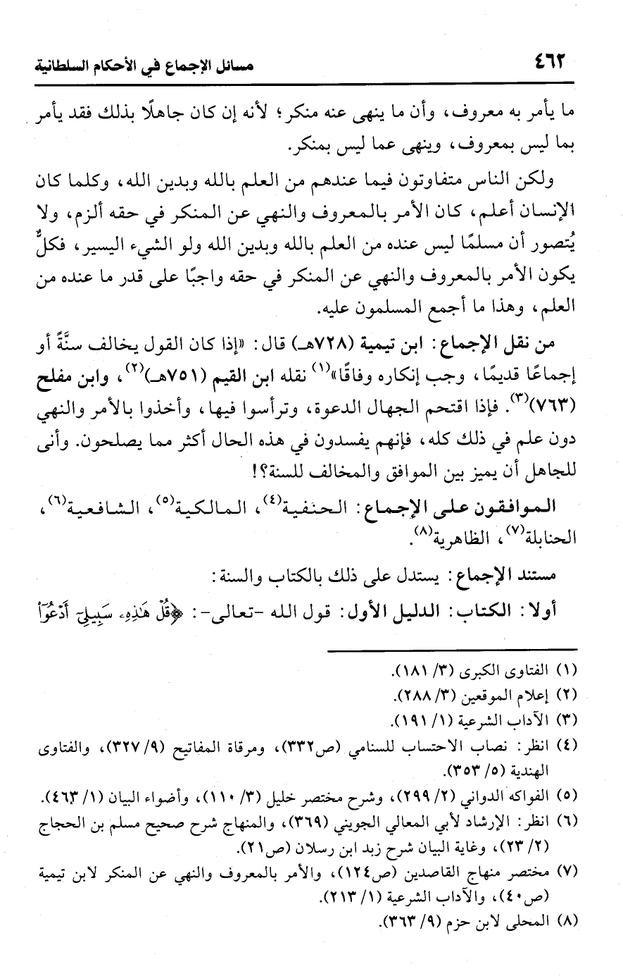 • من نقل الإجماع: ابن تيمية (728 هـ) قال: "إذا كان القول يخالف سنَّةً أو إجماعًا قديمًا، وجب إنكاره وفاقًا" (¬1) نقله ابن القيم (751 هـ) (¬2)، وابن مفلح (763) (¬3). فإذا اقتحم الجهال الدعوة، وترأسوا فيها، وأخذوا بالأمر والنهي دون علم في ذلك كله، فإنهم يفسدون في هذه الحال أكثر مما يصلحون. وأنى للجاهل أن يميز بين الموافق والمخالف للسنة؟ !