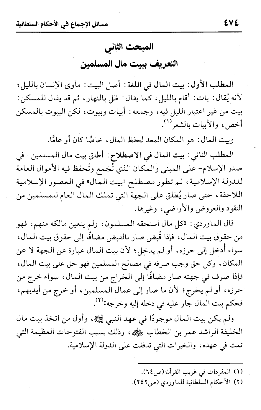 المطلب الثاني: بيت المال في الاصطلاح: أطلق بيت مال المسلمين -في صدر الإسلام- على المبنى والمكان الذي تُجْمع وتُحفظ فيه الأموال العامة للدولة الإسلامية، ثم تطور مصطلح "بيت المال" في العصور الإسلامية اللاحقة، حتى صار يُطلق على الجهة التي تملك المال العام للمسلمين من النقود والعروض والأراضي، وغيرها.