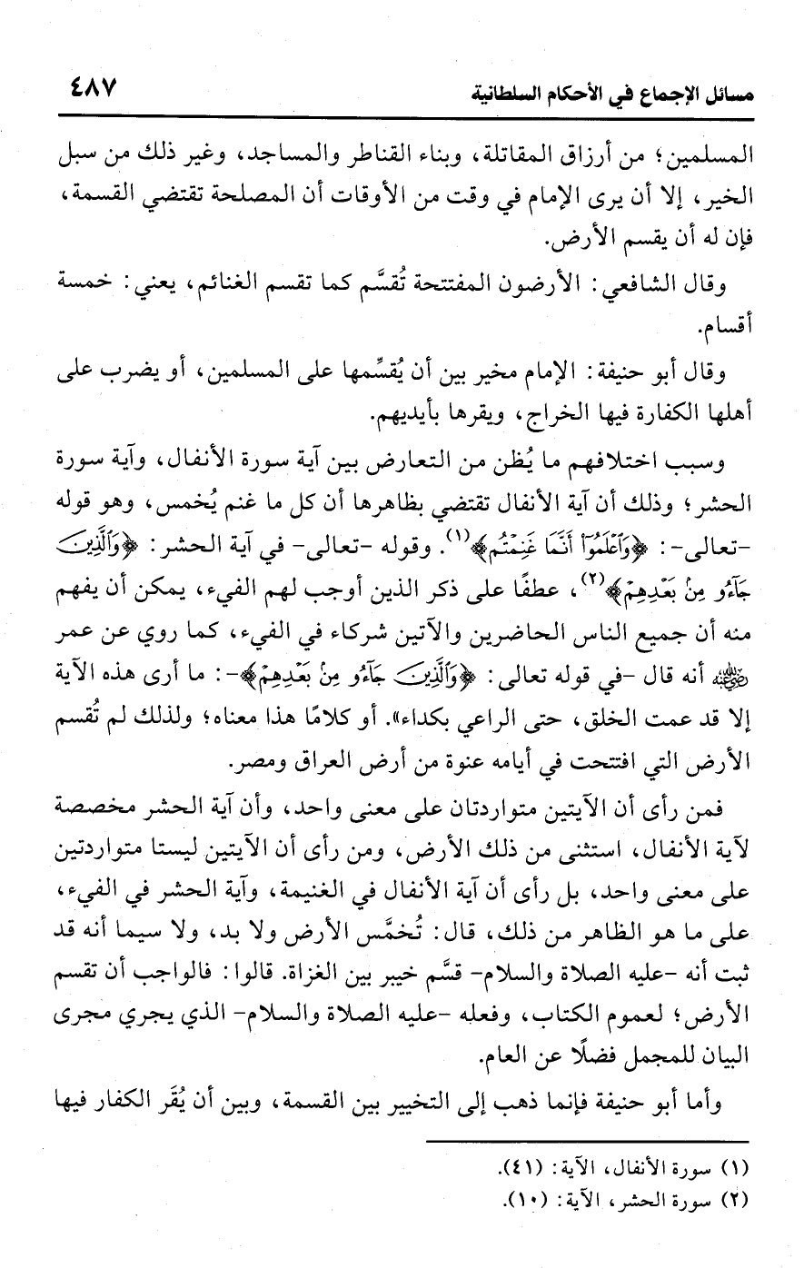 فمن رأى أن الآيتين متواردتان على معنى واحد، وأن آية الحشر مخصصة لآية الأنفال، استثنى من ذلك الأرض، ومن رأى أن الآيتين ليستا متواردتين على معنى واحد، بل رأى أن آية الأنفال في الغنيمة، وآية الحشر في الفيء، على ما هو الظاهر من ذلك، قال: تُخمَّس الأرض ولا بد، ولا سيما أنه قد ثبت أنه - عليه الصلاة والسلام - قسَّم خيبر بين الغزاة. قالوا: فالواجب أن تقسم الأرض؛ لعموم الكتاب، وفعله - عليه الصلاة والسلام- الذي يجري مجرى البيان للمجمل فضلًا عن العام.
