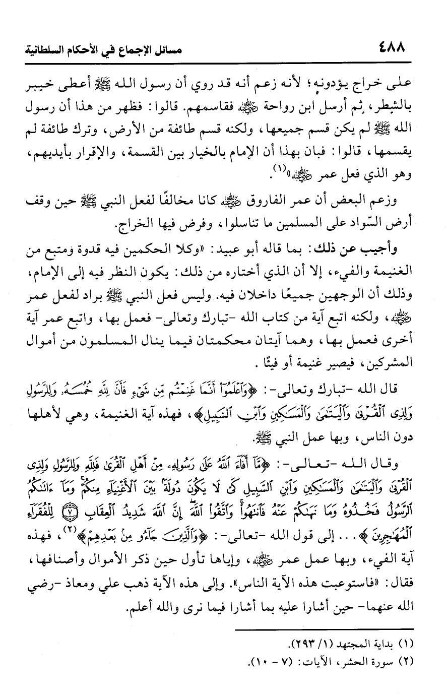 وقال اللَّه -تعالى-: {مَا أَفَاءَ اللَّهُ عَلَى رَسُولِهِ مِنْ أَهْلِ الْقُرَى فَلِلَّهِ وَلِلرَّسُولِ وَلِذِي الْقُرْبَى وَالْيَتَامَى وَالْمَسَاكِينِ وَابْنِ السَّبِيلِ كَيْ لَا يَكُونَ دُولَةً بَيْنَ الْأَغْنِيَاءِ مِنْكُمْ وَمَا آتَاكُمُ الرَّسُولُ فَخُذُوهُ وَمَا نَهَاكُمْ عَنْهُ فَانْتَهُوا وَاتَّقُوا اللَّهَ إِنَّ اللَّهَ شَدِيدُ الْعِقَابِ (7) لِلْفُقَرَاءِ الْمُهَاجِرِينَ}. . . إلى قول اللَّه -تعالى-: {وَالَّذِينَ جَاءُوا مِنْ بَعْدِهِمْ} (¬2)، فهذه آية الفيء، وبها عمل عمر -رضي اللَّه عنه-، وإياها تأول حين ذكر الأموال وأصنافها، فقال: "فاستوعبت هذه الآية الناس". وإلى هذه الآية ذهب علي ومعاذ -رضي اللَّه عنهما - حين أشارا عليه بما أشارا فيما نرى واللَّه أعلم.