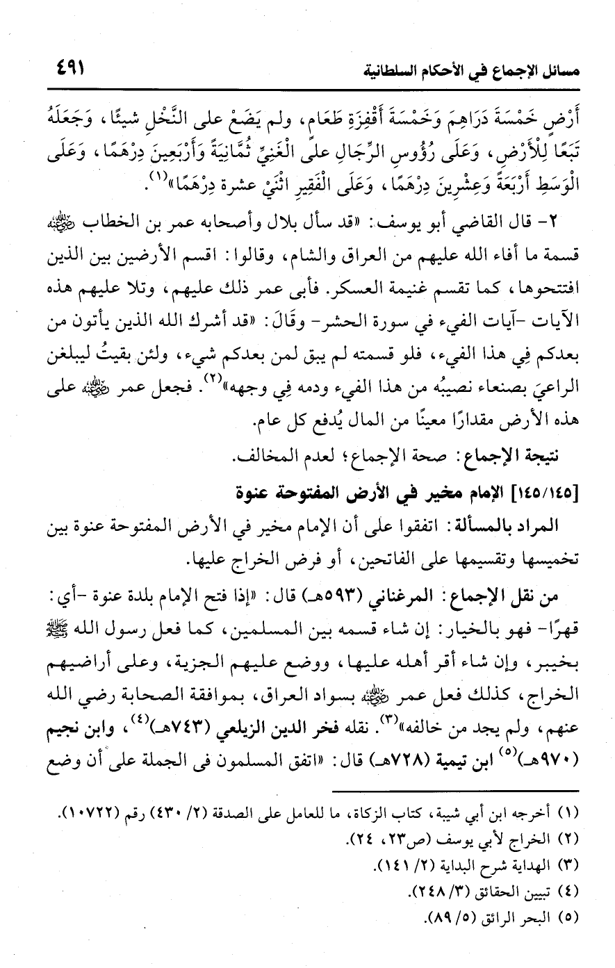 • من نقل الإجماع: المرغناني (593 هـ) قال: "إذا فتح الإمام بلدة عنوة-أي: قهرًا- فهو بالخيار: إن شاء قسمه بين المسلمين، كما فعل رسول اللَّه -صلى اللَّه عليه وسلم- بخيبر، وإن شاء أقر أهله عليها، ووضع عليهم الجزية، وعلى أراضيهم الخراج، كذلك فعل عمر -رضي اللَّه عنه- بسواد العراق، بموافقة الصحابة رضي اللَّه عنهم، ولم يجد من خالفه" (¬3). نقله فخر الدين الزيلعي (743 هـ) (¬4)، وابن نجيم (975 هـ) (¬5) ابن تيمية (728 هـ) قال: "اتفق المسلمون في الجملة على أن وضع