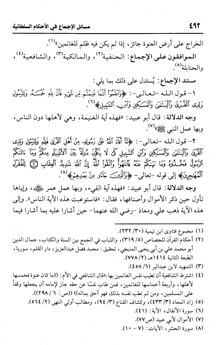 • وجه الدلالة: قال أبو عبيد: "فهذه آية الفيء، وبها عمك عمر -رضي اللَّه عنه-، وإياها تأول حين ذكر الأموال وأصنافها، فقال: "فاستوعبت هذه الآية الناس". وإلى هذه الآية ذهب علي ومعاذ -رضي اللَّه عنهما- حين أشارا عليه بما أشارا فيما
